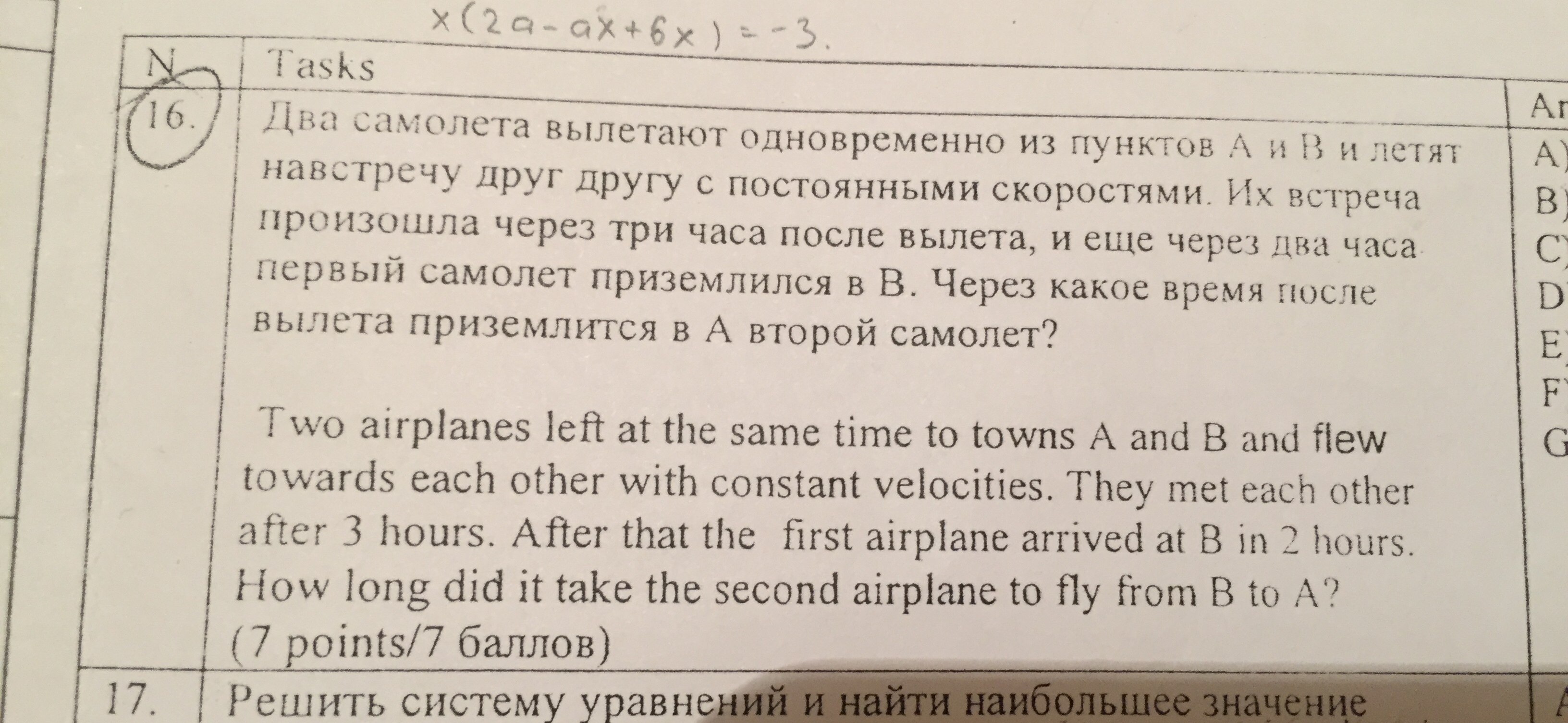 Второй самолет после встречи пролетел 3х км со скоростью у км в час и затратил на путь