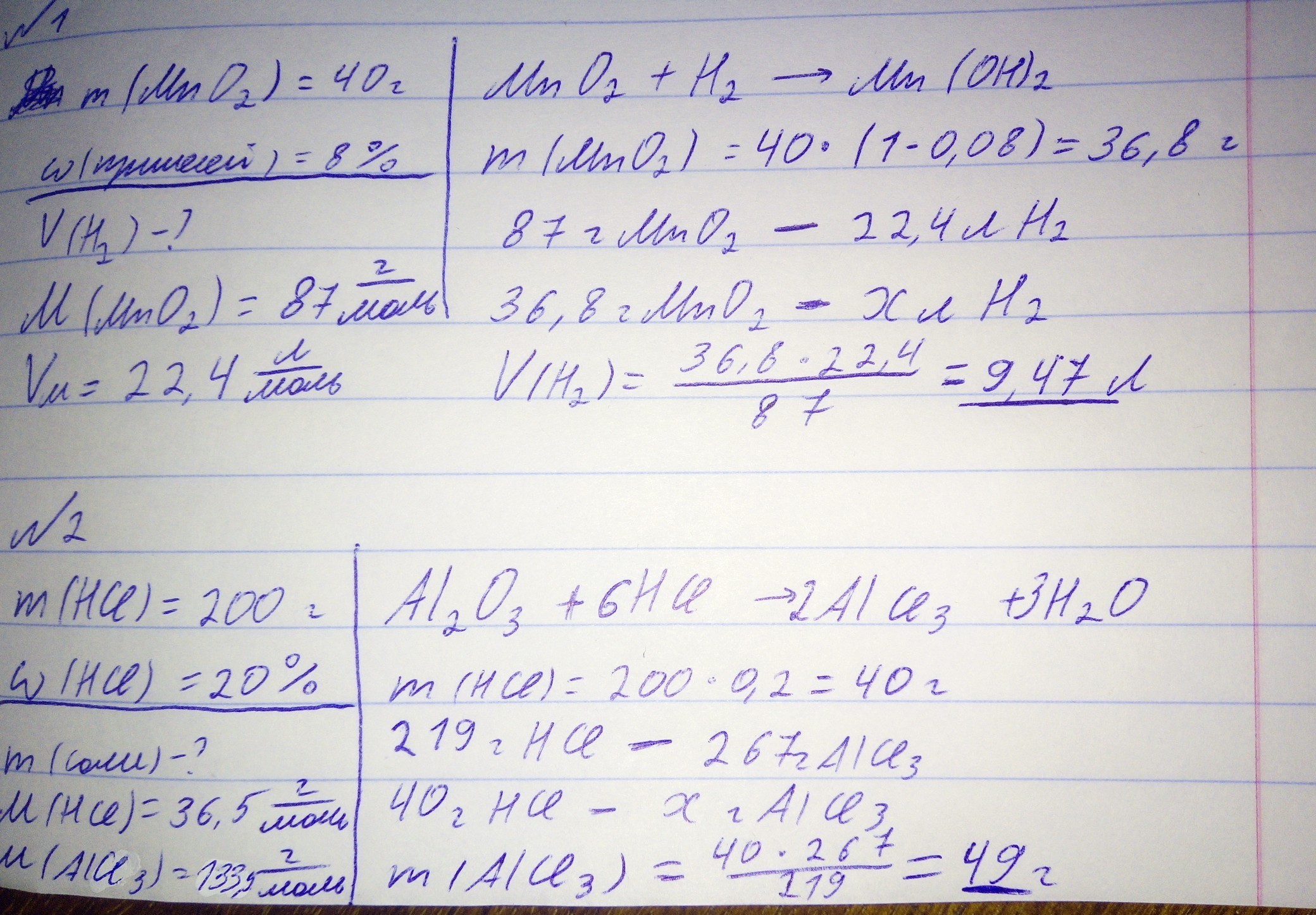 в первом задании мы нашли массу чистого вещества, а затем вычислили объём водорода.