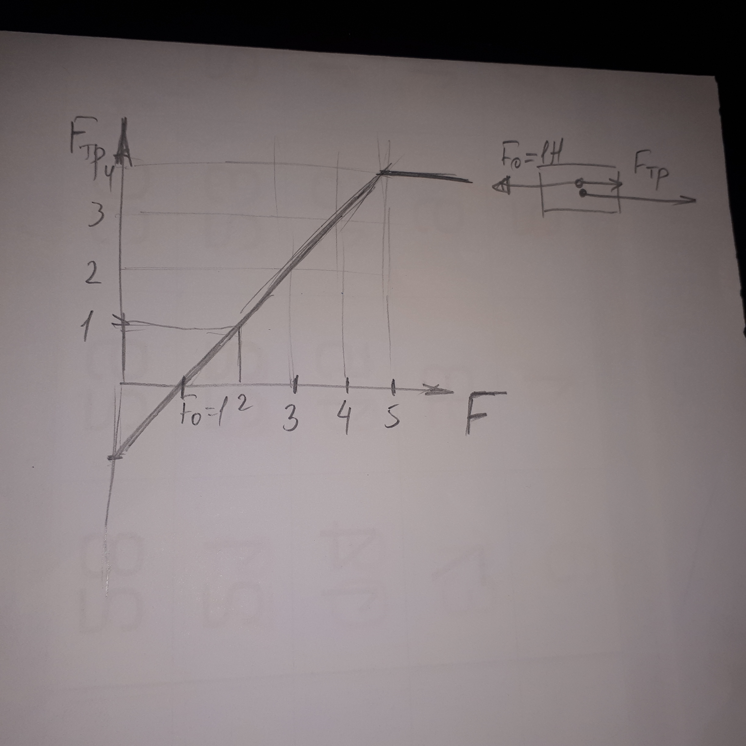 На тело массой m=2кг, которое находится на горизонтальной плоскости, действуют сила F0 = 1H, направленная горизонтально. В противоположном направлении действует сила F. Коэффициент трения μ = 0,2. Постройте график зависимости трения от силы F.