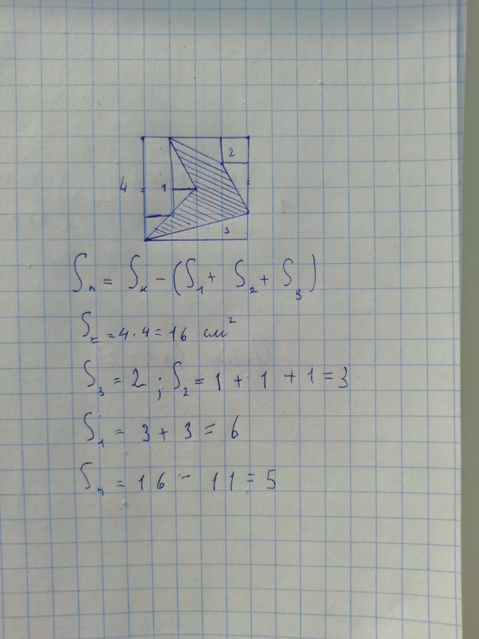Пятиугольник не правильный, а значит иной формулы для нахождения его площади не существует, значит разобьём фигуру на части, или же впишем в другую фигуру, в данном случае в квадрат