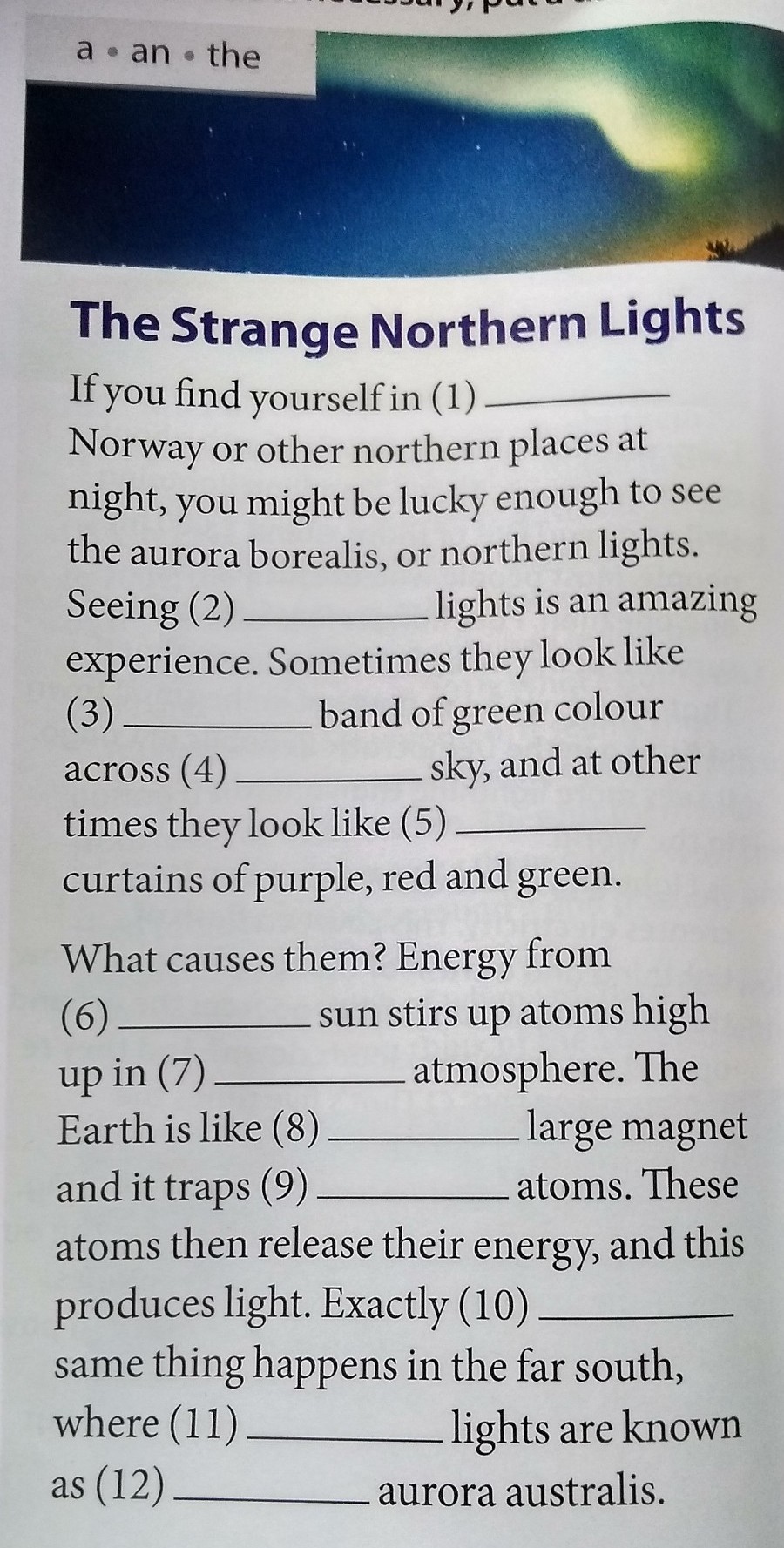If you find yourself in (1) Norway or other northern places at night, you might be lucky enough to see the aurora borealis, or northern lights. Seeing (2) the lights is an amazing experience. Sometimes they look like (3) a band of green colour across (4) the sky, and at other times they look like (5) curtains of purple, red and green. What causes them? Energy from (6) the sun stirs up atoms high up in (7) the atmosphere. The Earth is like (8) a large magnet and it traps (9) atoms. These atoms then release their energy, and this produces light. Exactly (10) the same thing happens in the far south, where (11) the lights are known as (12) the aurora australis.