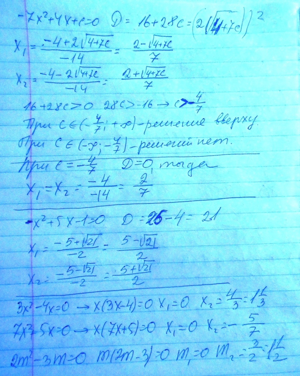 квадратные уравнения: -7x²+4x+c=0 , -x²+5x-1=0
