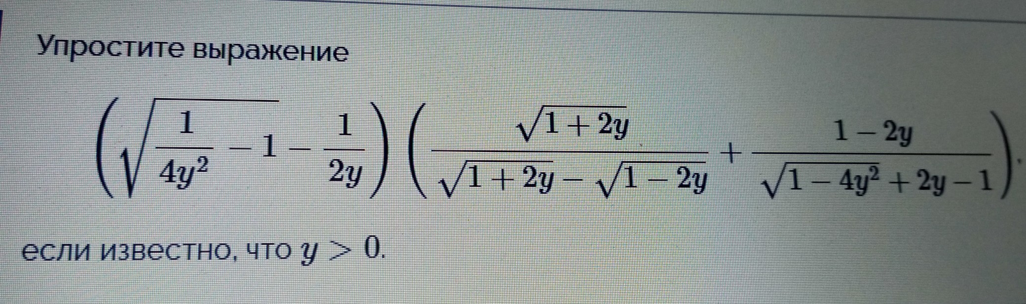 ; ; y>0\\Big (sqrt{frac{1}{4y^2}-1}-frac{1}{2y}Big )cdot Big (frac{sqrt{1+2y}}{sqrt{1+2y}-sqrt{1-2y}}+frac{1-2y}{sqrt{1-4y^2}+2y-1}Big )=\\=Big (sqrt{frac{1-4y^2}{4y^2}}-frac{1}{2y}Big )cdot Big (frac{sqrt{1+2y}}{sqrt{1+2y}-sqrt{1-2y}}}+frac{1-2y}{sqrt{(1-2y)(1+2y)}-(sqrt{1-2y})^2}Big )=\\