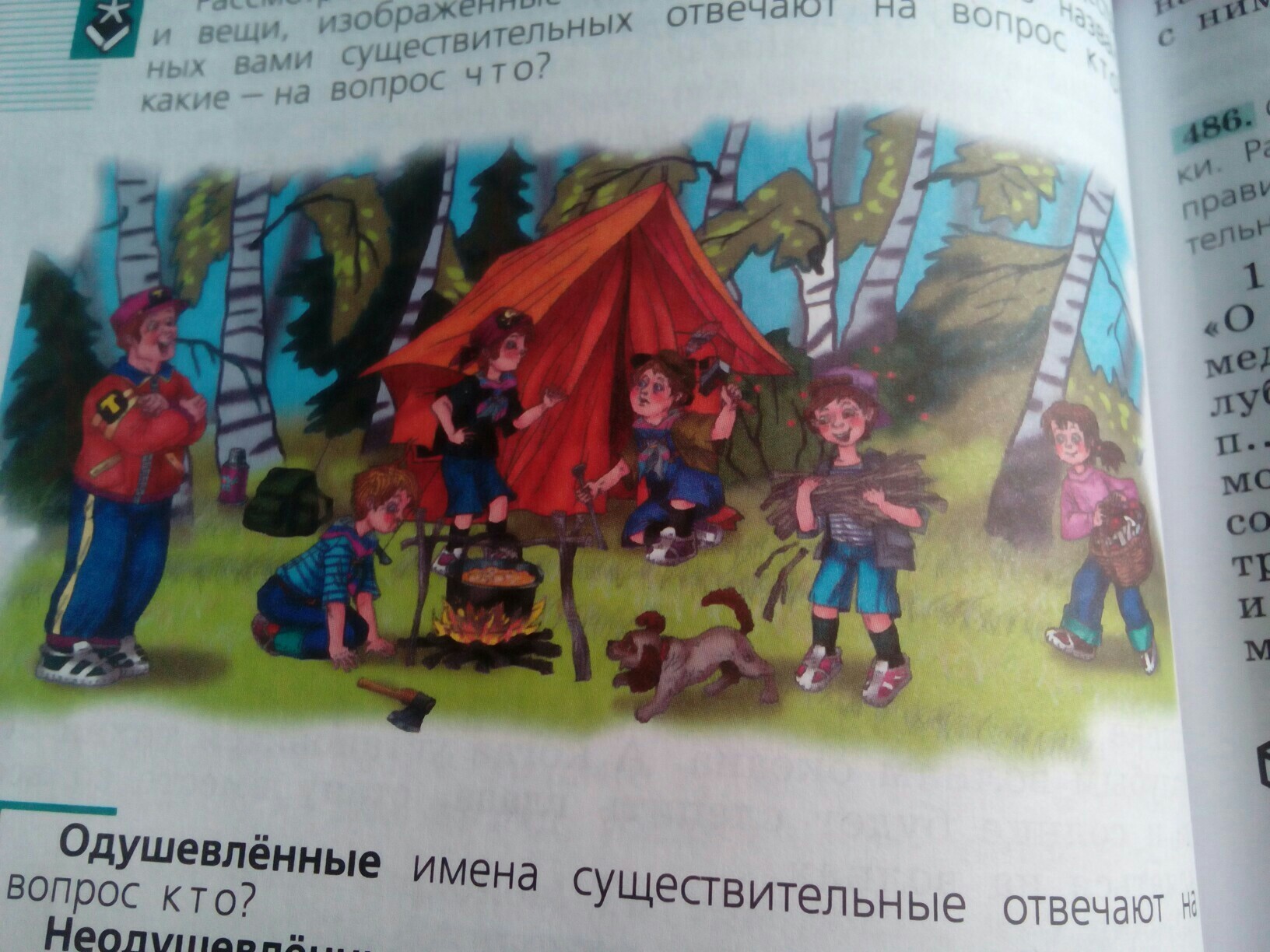 Мальчик с учителем пришли в лес. Они выбрали поляну и разбили лагерь. Ребята стали заниматься работой. Тренер им помогал. Один мальчик(можно вставить имя)готовит обед, а другой помогает ставить палатку. Рядом с ними собачка виляет хвостом. Девочки собирают припасы и дрова.