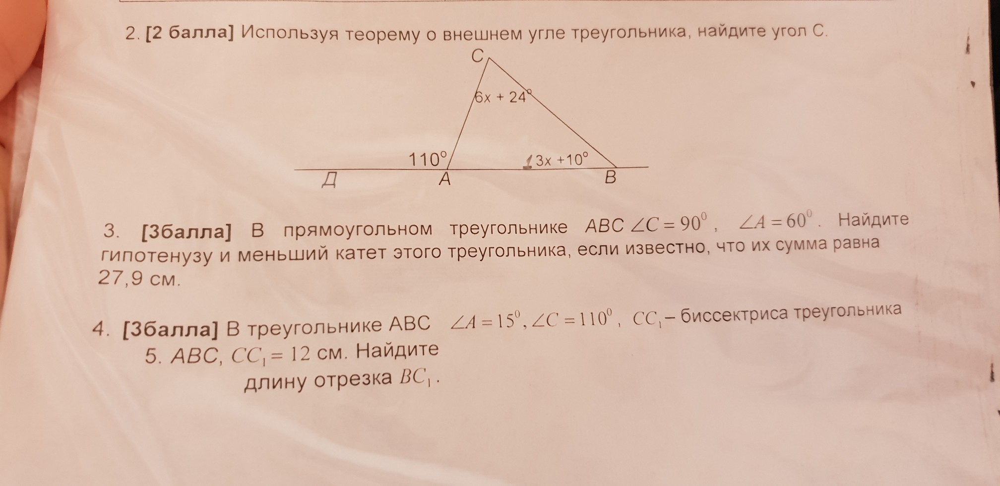 внешний угол треугольника равен сумме двух не смежных с ним углов