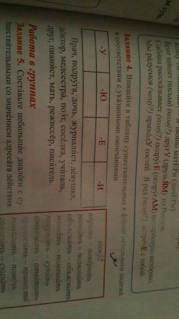 -У: врачу, журналисту, поэту, доктору, другу, пианисту, режиссёру; -Ю: учителю, писателю; -Е: подруге, девушке, медсестре, соседке; -И: дочери, матери.