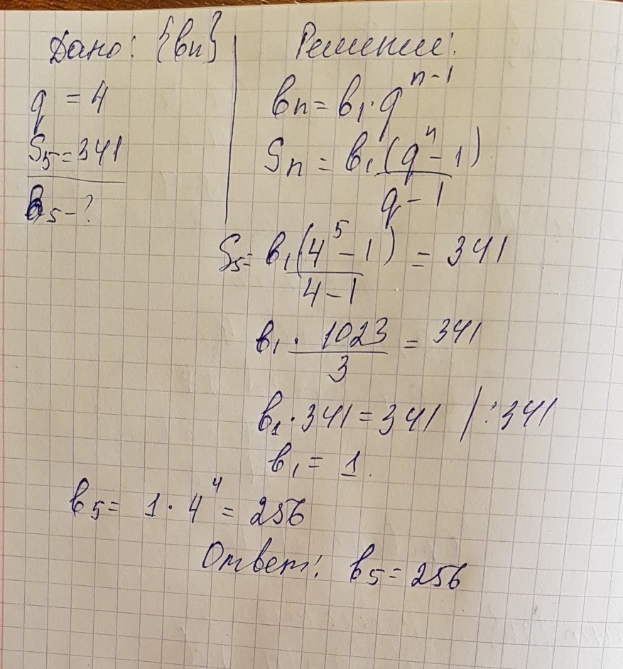 Знаменатель геометрической прогрессии равна 4, а сумма пяти первых членов 341. найдите пятый член арифметической прогрессии