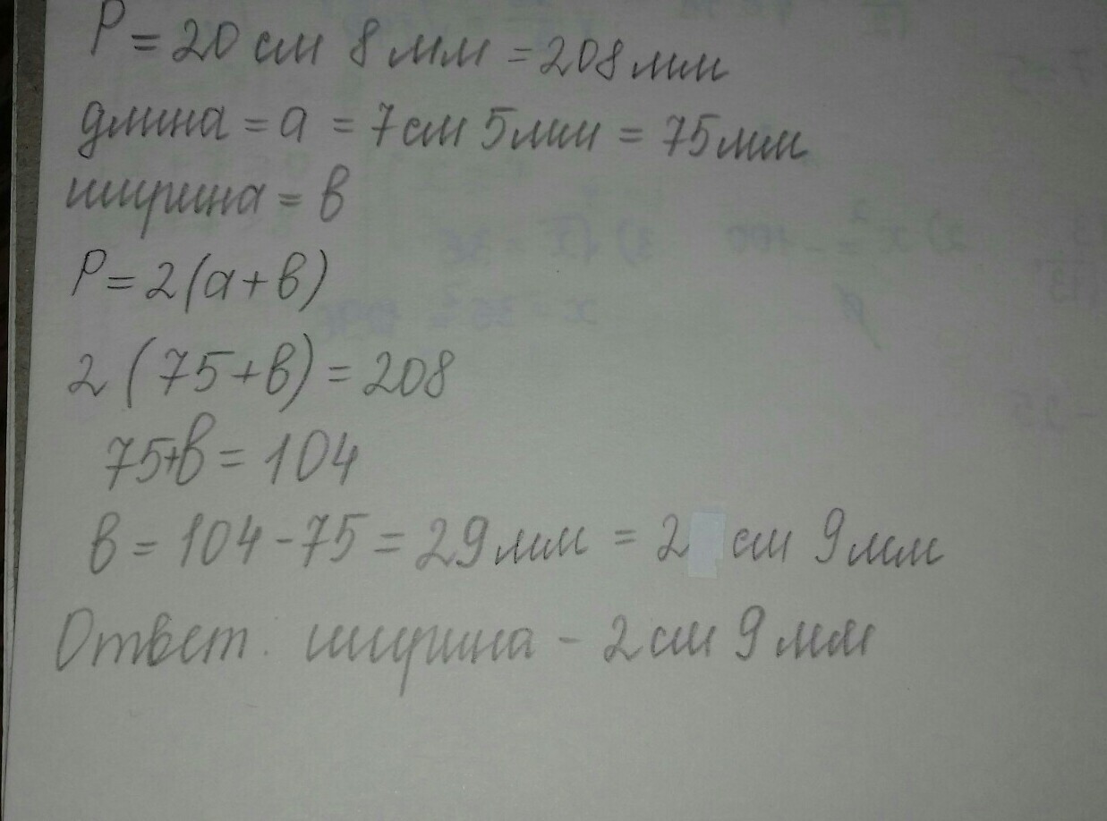 Периметр прямоугольника равен 20 см 8 мм, а его длина 7 см 5 мм. Найдите ширину прямоугольника.