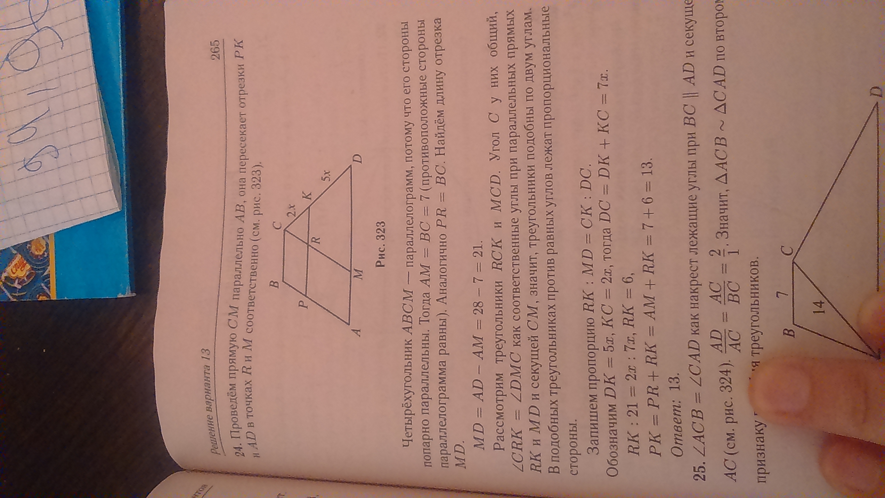 Прямая параллельная основаниям трапеции ABCD, пересекает ее боковые стороны AB и CD в точках P и K соответственно. Найдите длину отрезка PK, если AD= 28, BC=7, DK : KC=5 : 2.