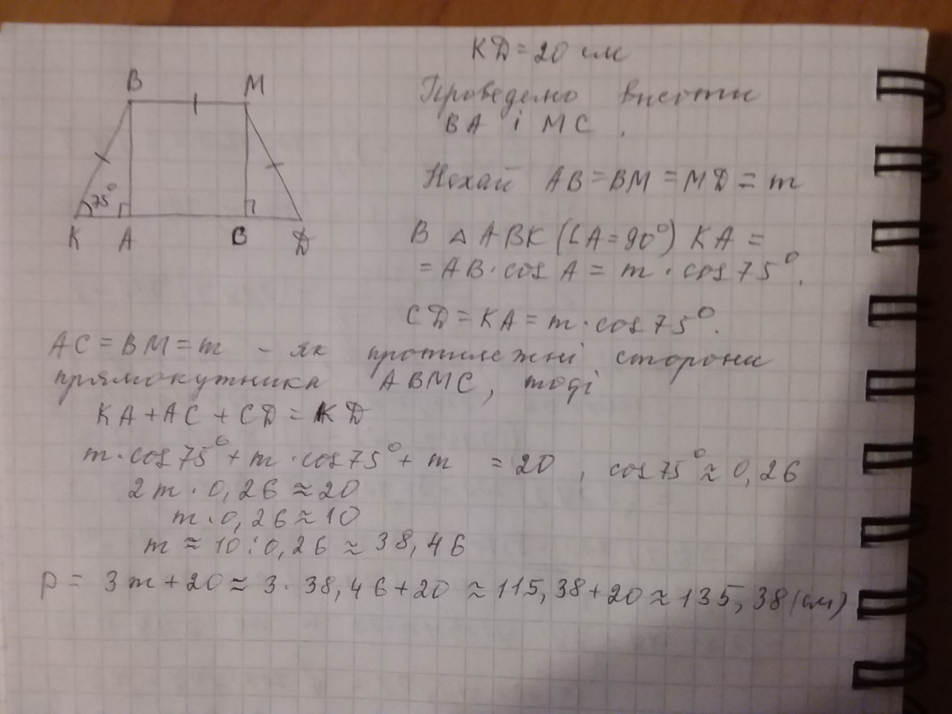 Довша основа KD рівнобедреної трапеції KBMD дорівнює 20 см, коротша основа BM і бічні сторони рівні. Визначте периметр трапеції, якщо гострий кут трапеції дорівнює 75°. (У розрахунках округлити числа до сотих)
