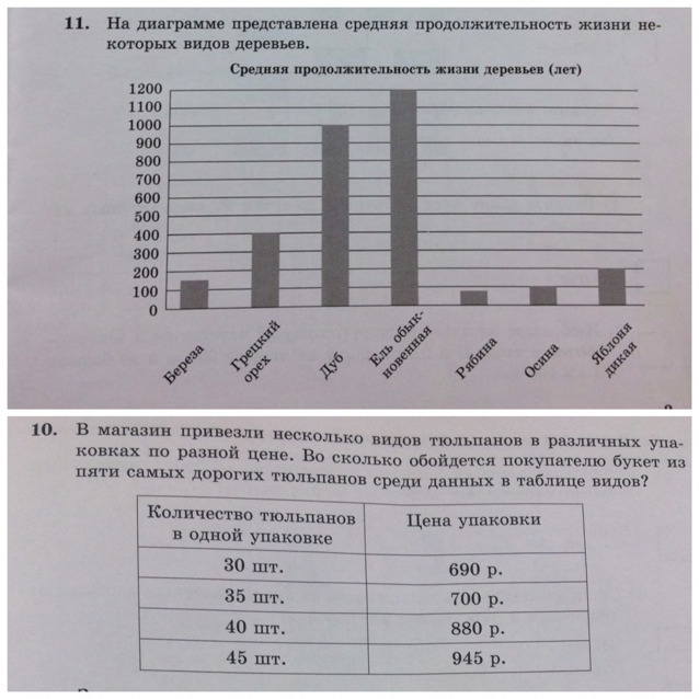 Помогите пожалуйста вот вопросы к 11 заданию:1.Какое из деревьев занимает втрое место по продолжительности среди представленных на диаграмме.2.Продолжительность жизни двух из представленных отличается в 3 раза?Какие это деревья.