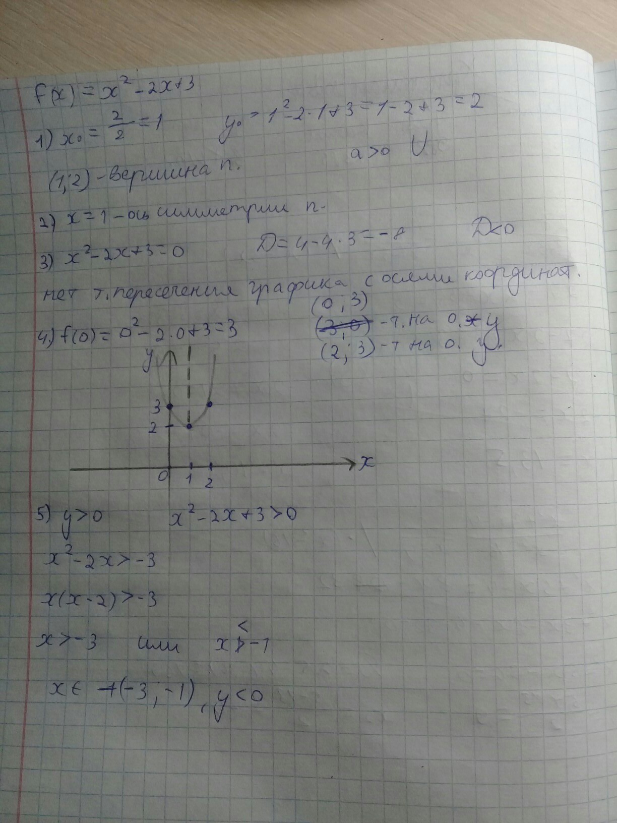 Дана функция f(x)=-x^2-2x+3. 1) Запишите координаты вершины параболы. 2) Найдите ось симметрии параболы. 3) Определите точки пересечения графика с осями координат. 4) Постройте график функции. 5) Найдите промежуток, в котором y>0.