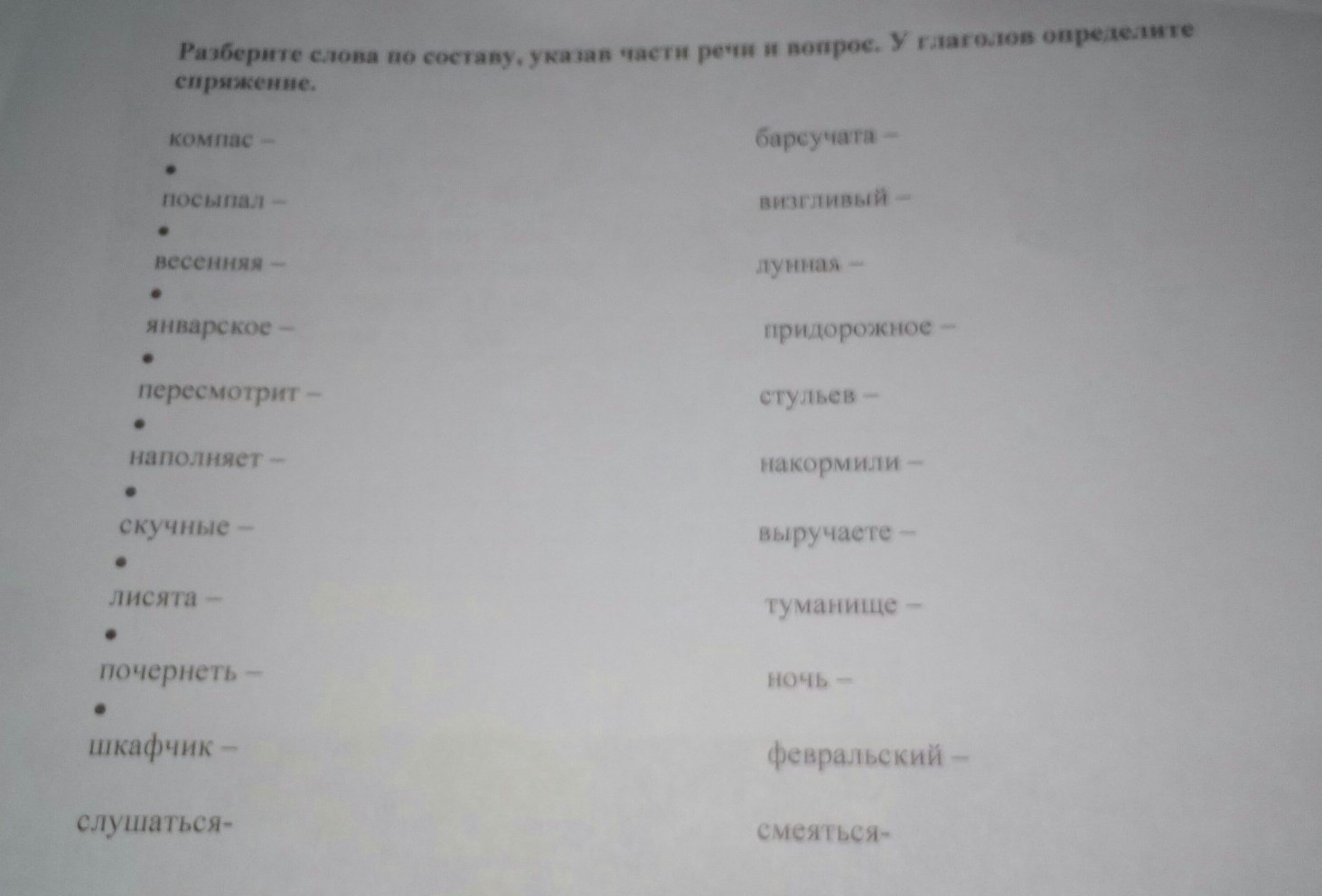 Компас - сущ. Что?, посыпал - 1 спр, весенняя - прилагательное, какая?, январское - прилагательное, какое?, пересмотрит- 2 спр, наполняет- 1 спр, скучные - прилагательное, какие?, лисята - сущ, кто?, почернеть - 1 спр, шкафчик - сущ, что?, слушаться - 1 спр, барсучата - сущ, кто?, визгливый - прилагательное, какой?, лунная- прилагательное, какая?, придорожное- прилагательное, какое?, стульев - сущ, чего?, накормили - 2 спр, выручайте- 1 спр, туманище - сущ, что?, ночь- сущ, что?, февральский - прилагательное, какой?, смеяться - 1 спр