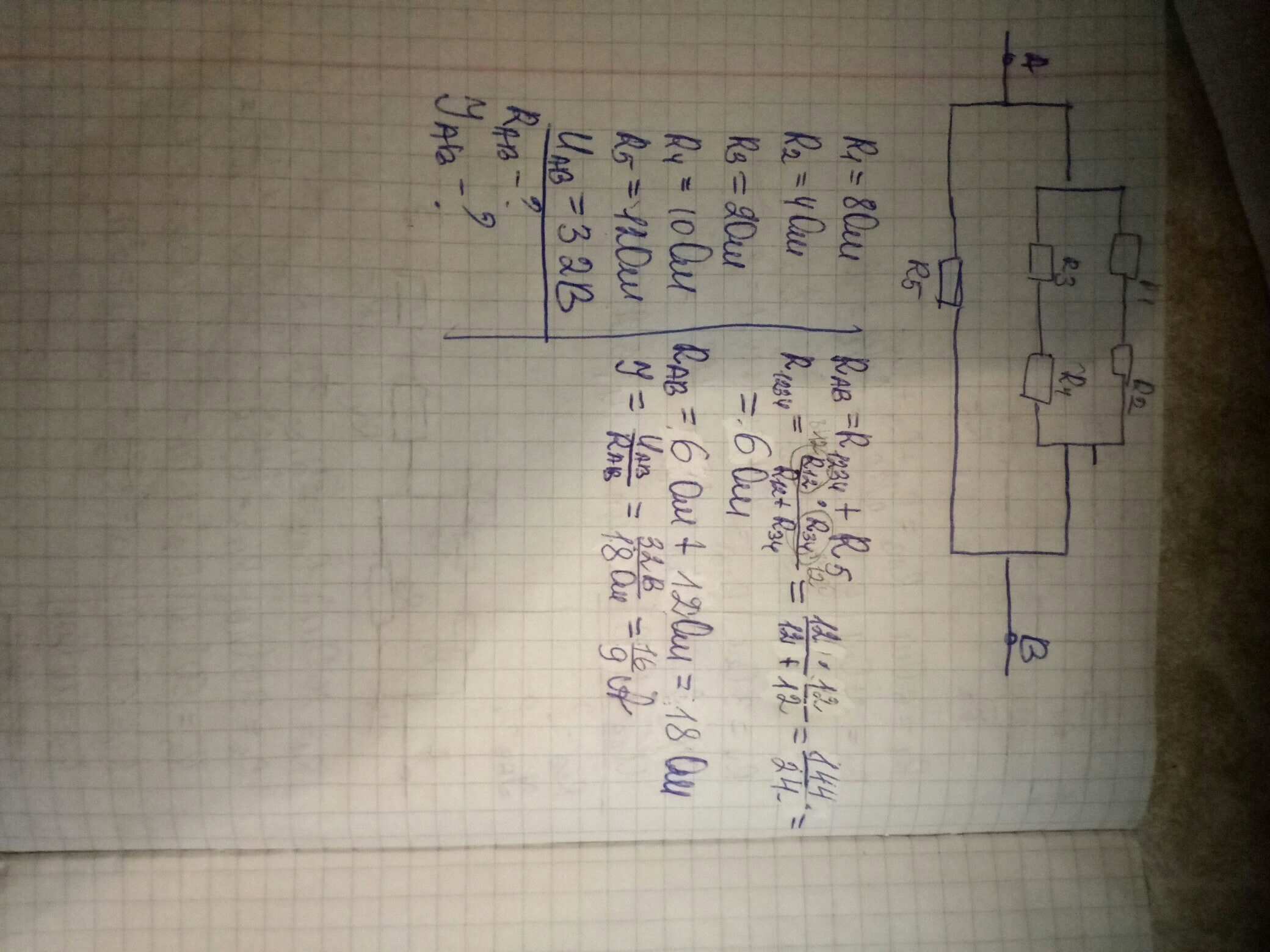 Rab=R5*R1234/(R5+R1234)= 12*6/18= 4 Ом, I=32/4=8A