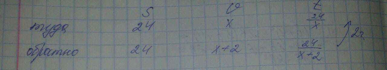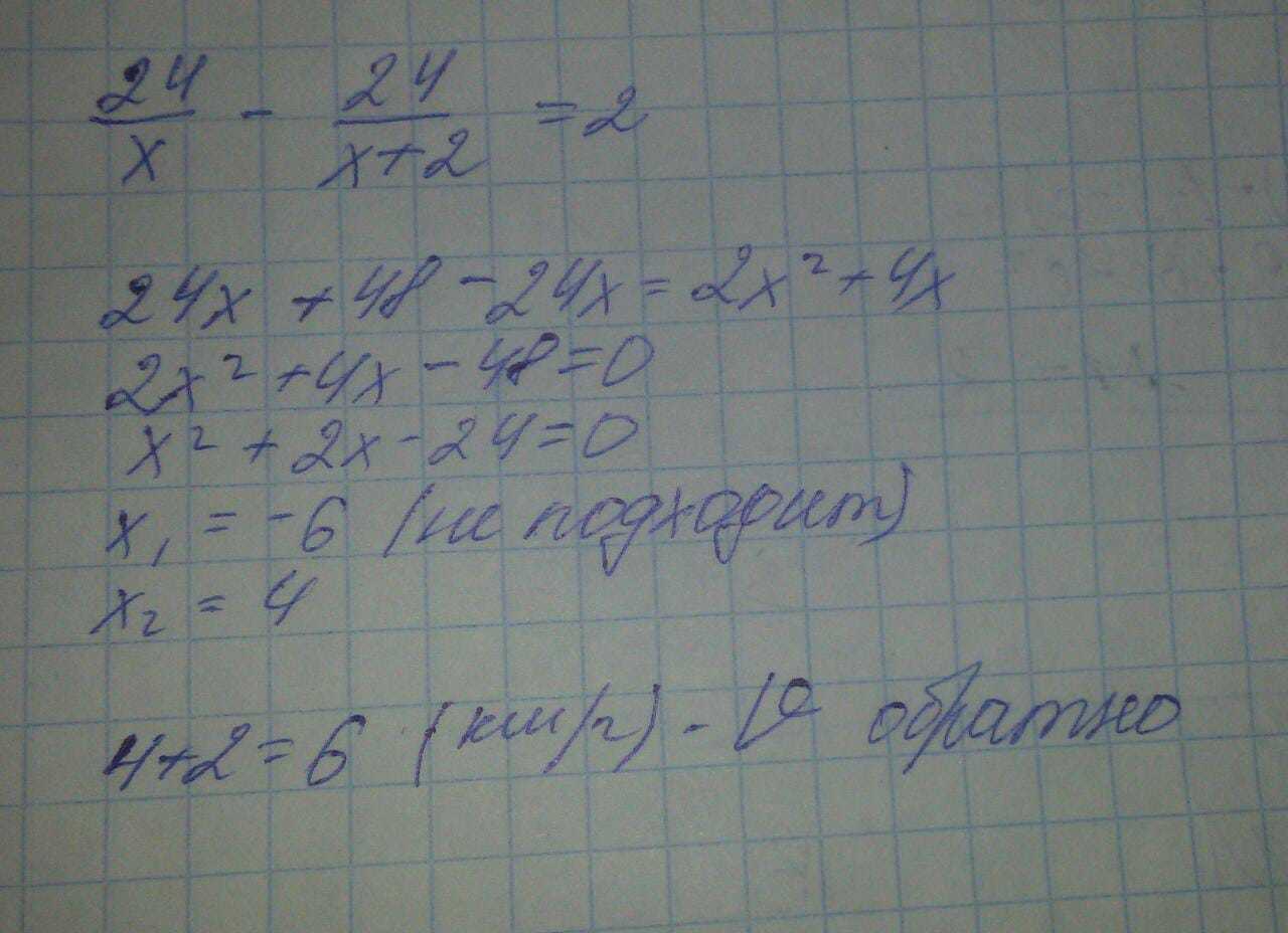 Расстояние между двумя пунктами А и В равно 24 км. Велосипедист проехал это расстояние из пункта А в пункт В с постоянной скоростью. При возвращение из В в А велосипедист увеличил скорость на 2 км/ч и прибыл в пункт А на 2 часа раньше. Какова скорость велосипедиста на обратном пути
