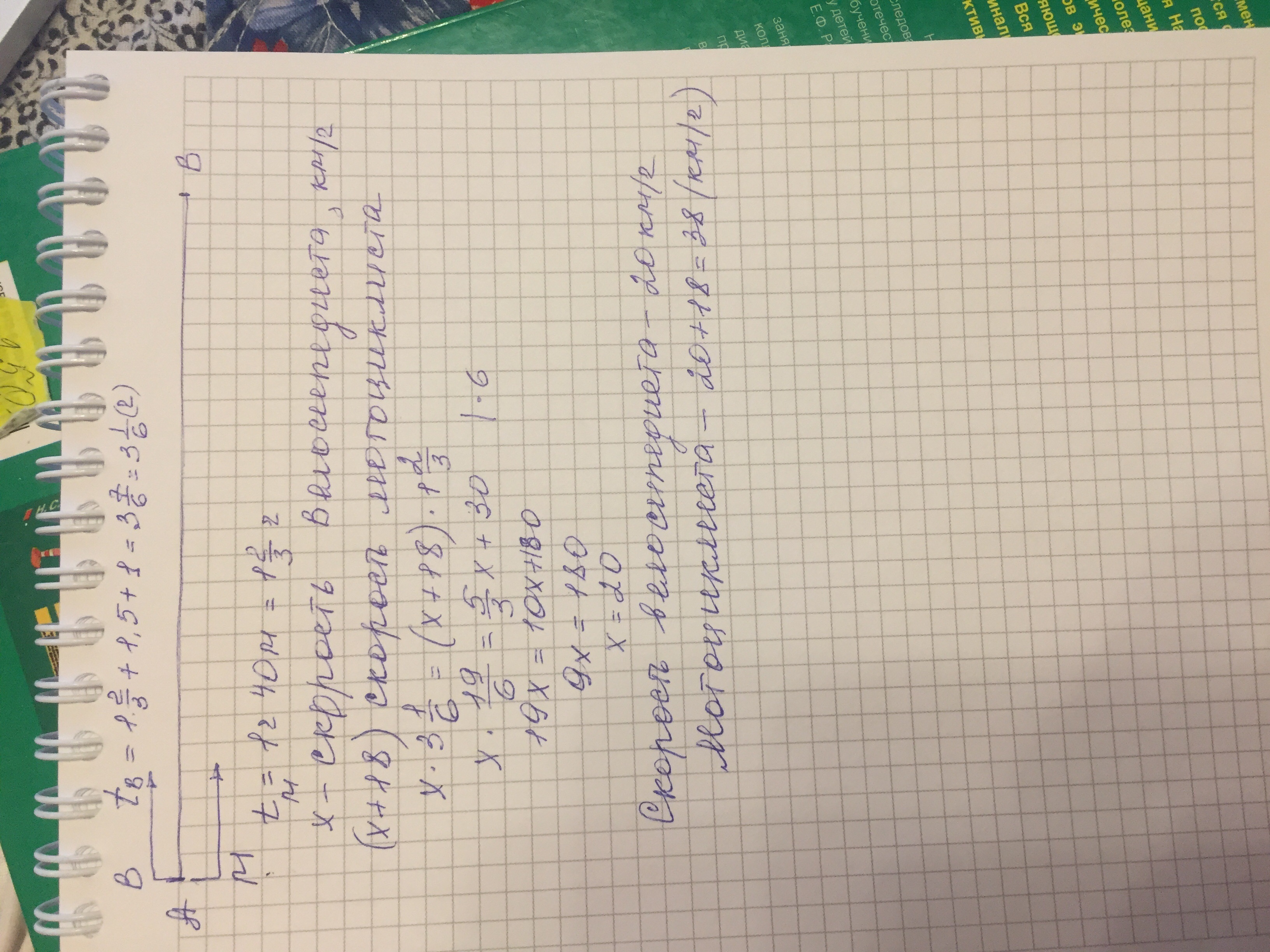 Из города A в город B выехал велосипедист. Через 1,5 часа из города А вслед за велосипедистом отправился мотоциклист, который обогнал велосипедиста и прибыл в город Б на один час раньше него. При этом на весь путь от А до Б мотоциклисту потребовался 1 час 40 мин. Чему равна скорость мотоциклиста, если она была на 18 км/ч больше скорости велосипедиста?