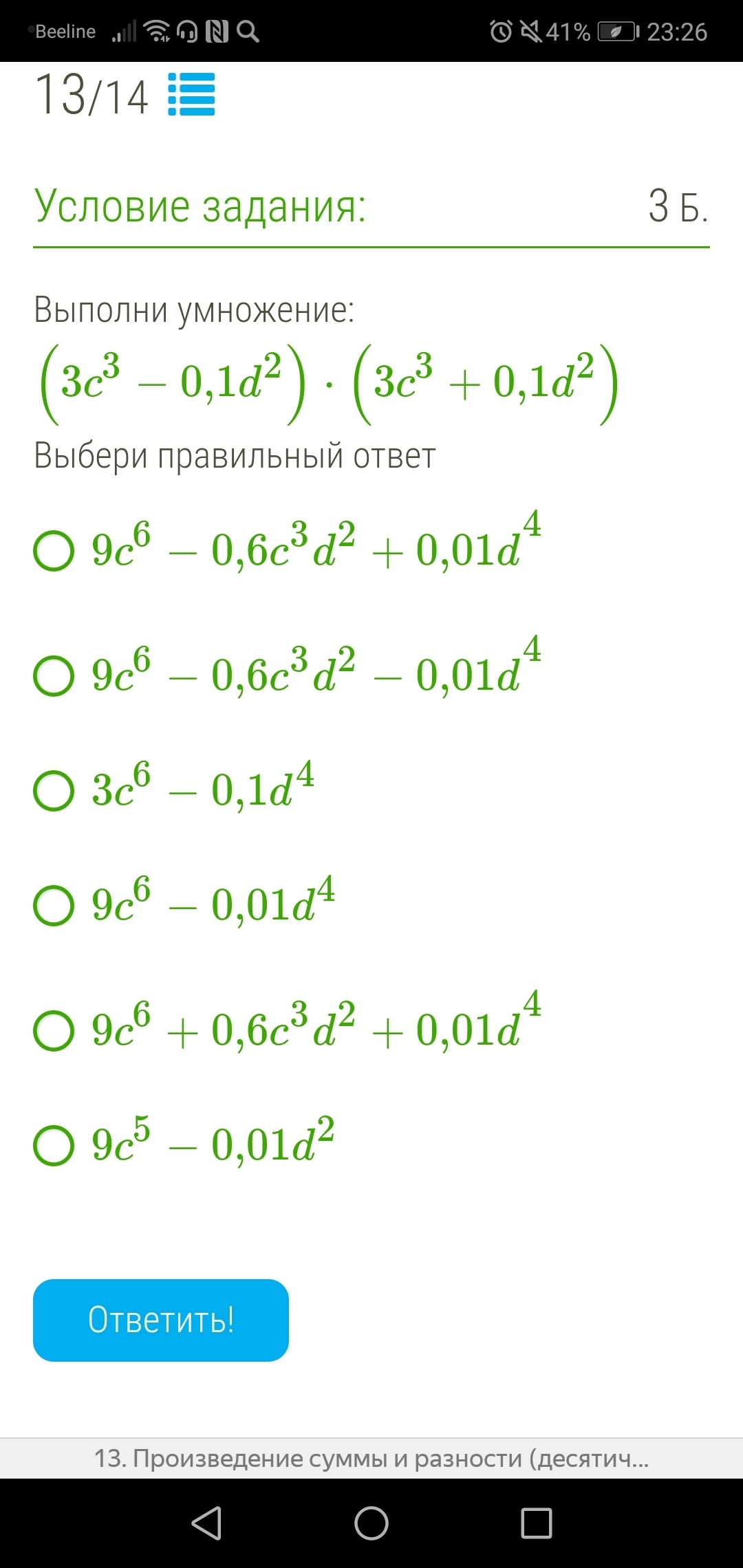(3с^3 - 0,1d^2)(3c^2 + 0,1d^2) = (3c^3)^2 - (0,1d^2)^2 = 9c^6 - 0,01d^4