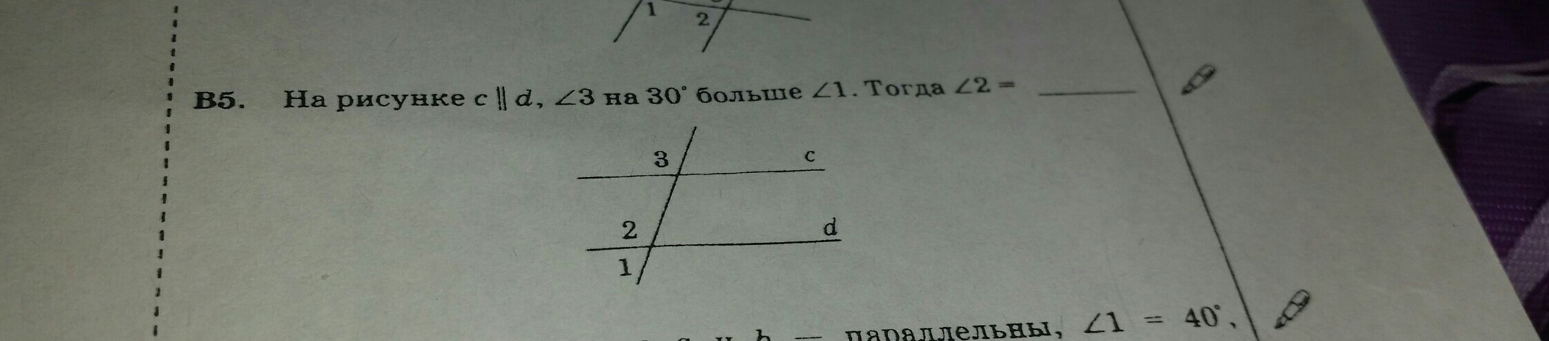 Пусть угол 1- х, тогда угол 3= х+30. х+х+30=180°( по теореме о односторонних углах) х= 75° (это угол 1) угол 2 равен 180-75(они смежные)