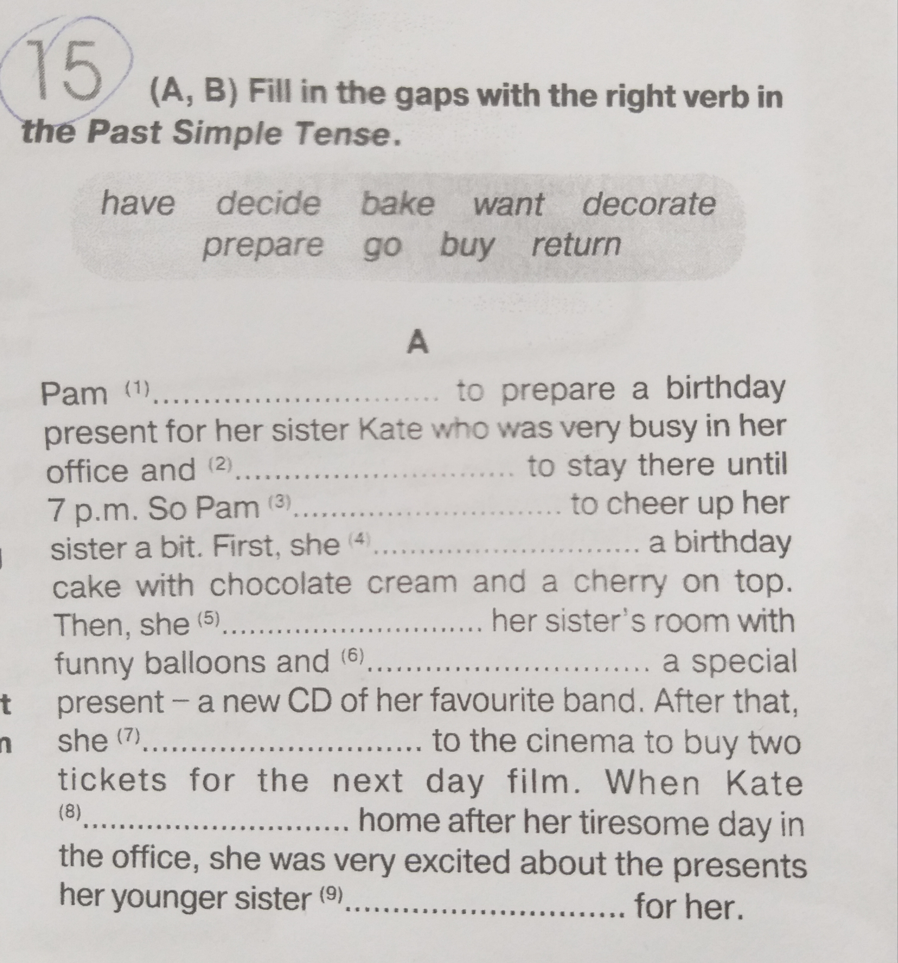 (A, B) Fill in the gaps with the right verb in the Past Simple Tense.