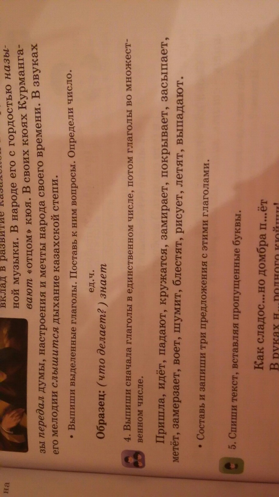 Ед.ч: Пришла, идёт, замирает, покрывает, засыпает, метёт, замерзает, воет, шумит, рисует. Мн.ч: падают, кружатся, блестят, летят, выпадают... Пришла долгожданная зима. Метель воет, шумит, засыпает снегом всё вокруг. Летят, кружатся и падают снежинки, а мороз рисует узоры на окнах.