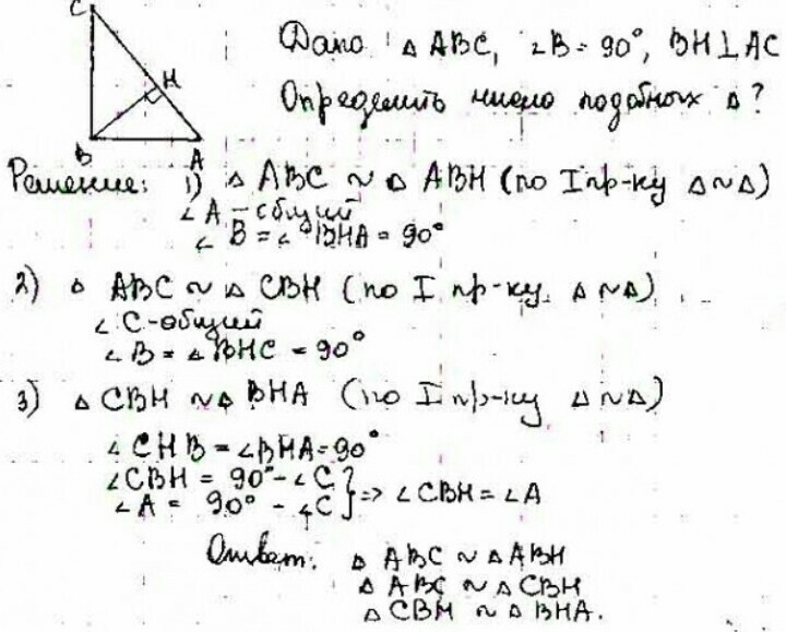 из вершины прямого угла треугольника опещна высота на гипотенузу.Сколько подобных треугольников получилось при этом.Пж помогите даю 25 баллов,только С РИСУНКОМ