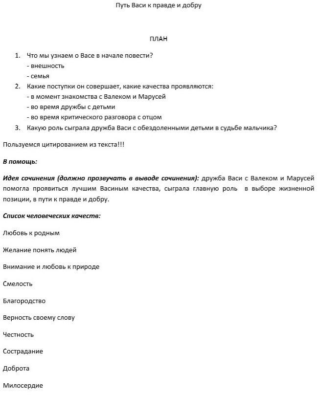 Сострадание, умение быть заботливым другом, проявились в начале общения Васи с Валиком и Марусей. Валек тоже был хорошим другом. Он, как - бы успокаивая Васю, говорил ему, что отец любит его, что он самый лучший в городе. Эта дружба была нечто дорогим для Васи, поэтому он не осуждал своих друзей за воровство. Вася посочувствовал им, их нищете.