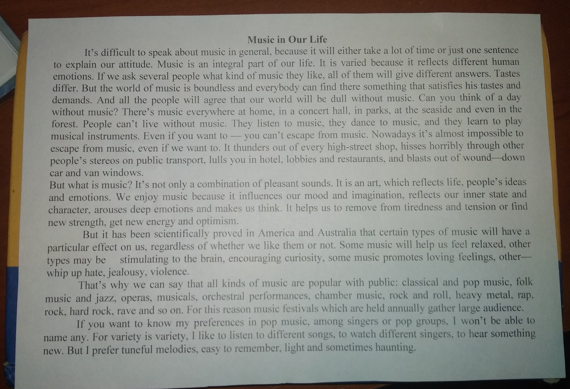 Музыка в нашей жизни трудно говорить о музыке вообще, потому что для объяснения нашего отношения потребуется либо много времени, либо всего одно предложение. Музыка - неотъемлемая часть нашей жизни. Она разнообразна, потому что отражает различные человеческие эмоции. Если мы спросим у нескольких людей, какая музыка им нравится, они ответят по-разному. О вкусах не спорят. Но мир музыки безграничен, и каждый может найти там то, что удовлетворяет его вкусам и требованиям. И все согласятся, что без музыки Наш мир будет скучным. Ты можешь придумать день без музыки? Музыка звучит дома, в концертном зале, в парках, на берегу моря и даже в лесу. Люди не могут жить без музыки. Они слушают музыку, танцуют под музыку и учатся играть на музыкальных инструментах. Даже если хочешь — от музыки никуда не деться. В наше время от музыки почти невозможно убежать, даже если хочется. Он гремит из каждого магазина на главной улице, ужасно шипит через чужие стереосистемы в общественном транспорте, убаюкивает вас в отеле, вестибюлях и ресторанах и взрывается из окон автомобиля и фургона. Но что такое музыка? Это не только сочетание приятных звуков. Это искусство, которое отражает жизнь, идеи и эмоции людей. Мы наслаждаемся музыкой, потому что она влияет на наше настроение и воображение, отражает наше внутреннее состояние и характер, вызывает глубокие эмоции и заставляет задуматься. Это помогает нам снять усталость и напряжение или обрести новые силы, получить новую энергию и оптимизм. Но научно доказано в Америке и Австралии, что определенные типы музыки будут оказывать на нас особое влияние, независимо от того, нравится нам это или нет. Какая-то музыка поможет нам чувствовать себя расслабленными, другие типы могут быть нагнетать ненависть, ревность, насилие. стимулируя мозг, поощряя любопытство, какая-то музыка способствует любовным чувствам, другая Вот почему мы можем сказать, что все виды музыки пользуются популярностью у публики; классическая и поп-музыка, народная музыка и джаз, оперы, мюзиклы, оркестровые выступления, камерная музыка, рок - н-ролл, хэви-метал, рэп, рок, хард-рок, рейв и так далее. Именно поэтому музыкальные фестивали, которые проводятся ежегодно, собирают большую аудиторию. Если вы хотите знать мои предпочтения в поп-музыке, среди певцов и поп-групп, я не смогу назвать ни одного. Для разнообразия - это разнообразие, мне нравится слушать разные песни, смотреть разных певцов, слышать что-то новое. Но я предпочитаю мелодичные мелодии, легко запоминающиеся, легкие и иногда навязчивые.
