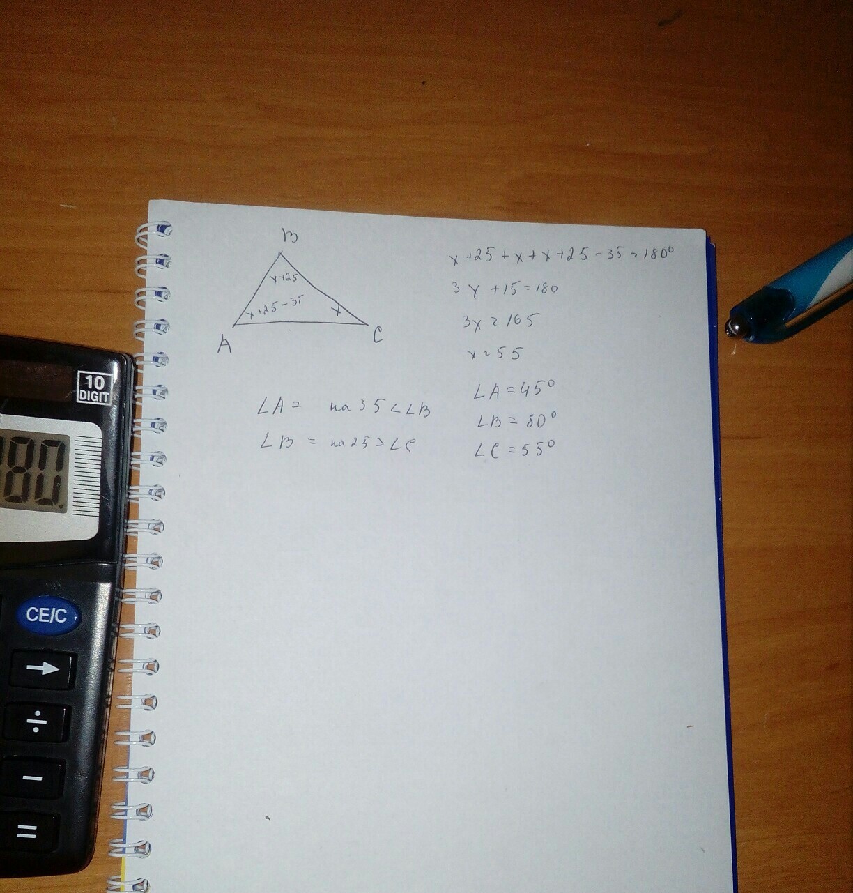 Найти углы треугольника АВС, если угол А на 35 градусов меньше угла В, а угол В на 25 градусов больше угла С
