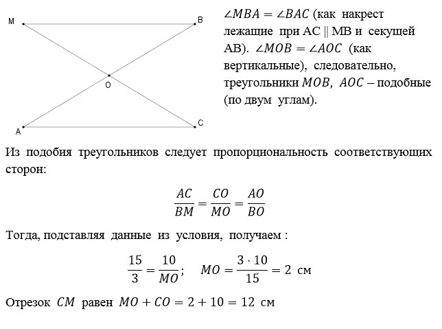 Отрезки AB и CM пересекаются в точке О так, что AC||BM, найдите длину отрезка CM,если AC=15см, BM=3см, CO=10см.