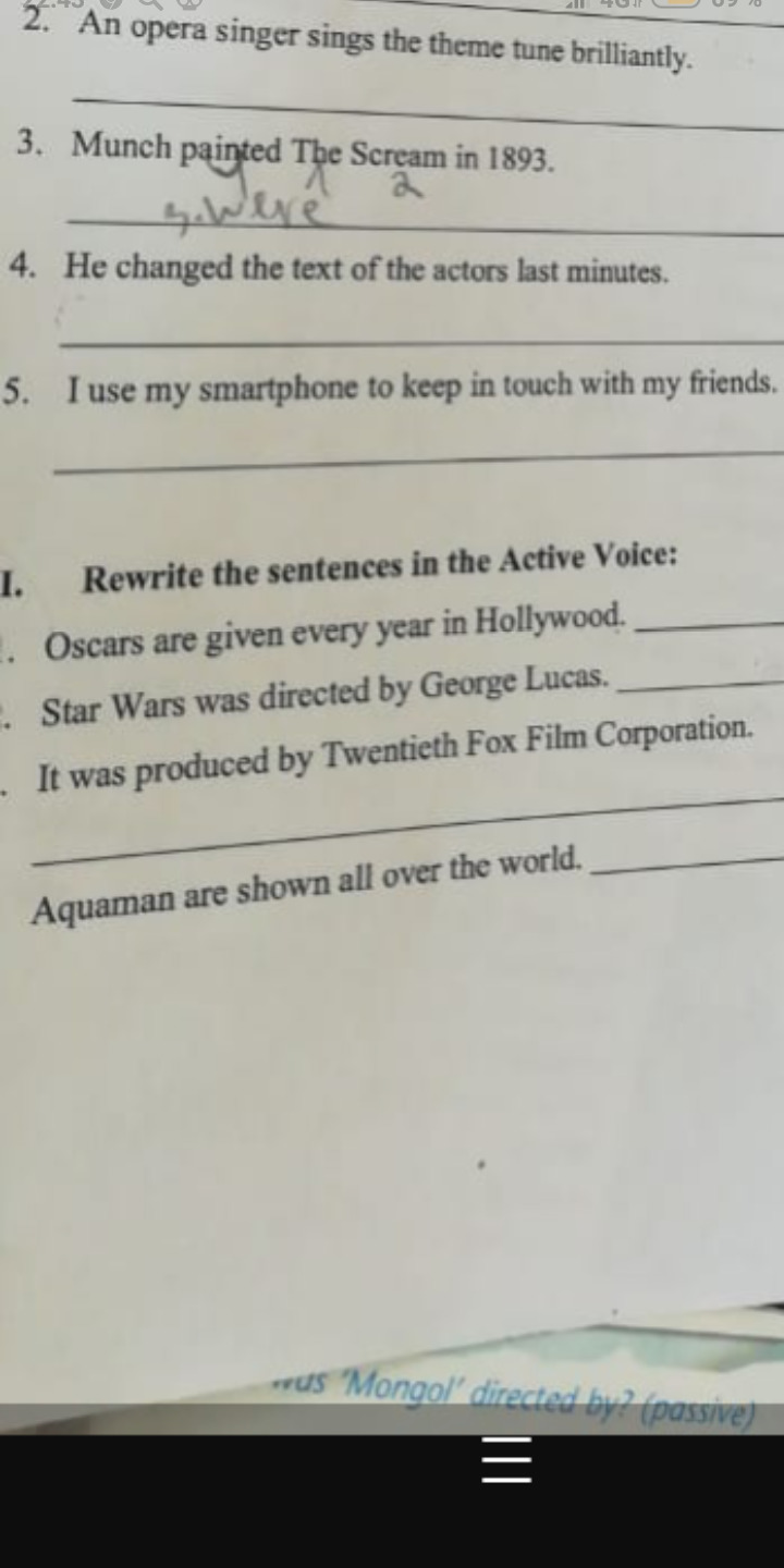 1. They gives oscars every year in Hollywood. (если спросят почему поставил "they" отвечай что в активном залоге должно быть лицо которое совершает действие, в данном случае слово "they" "рус. они" этим самым лицом и является).