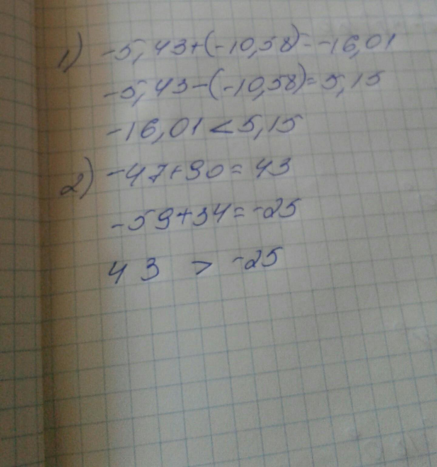 1) сумму чисел -5,43 и (-10,58) и их разность;