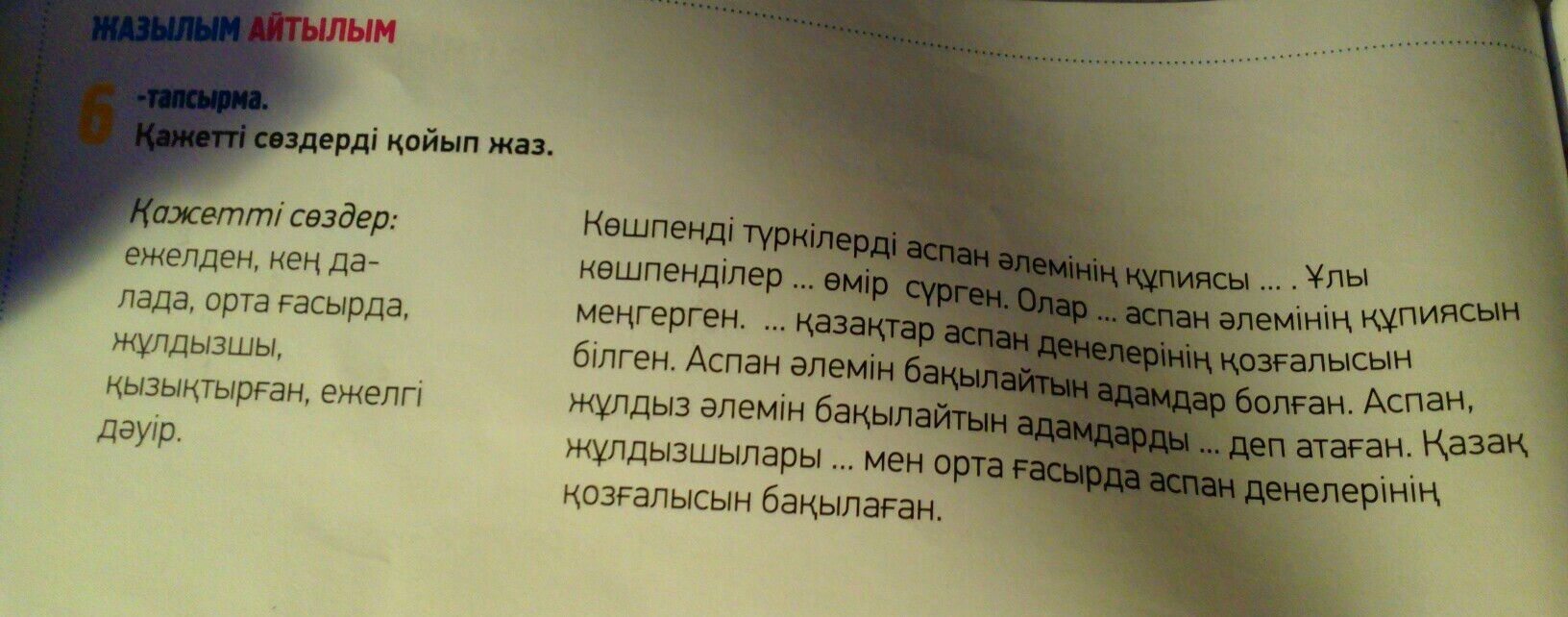 1. Қызықтырған, 2. Ежелден, 3. Кен далада, 4. Орта ғасырда, 5. Жұлдызшы, 6. Ежелгі дәуір