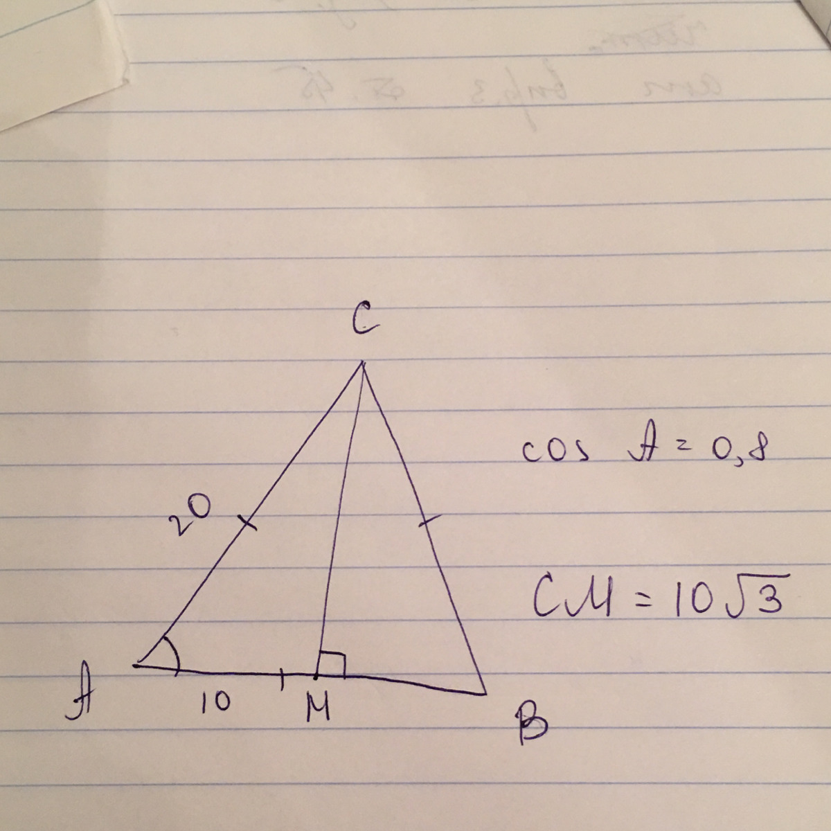 В равностороннем треугольнике ABC с основой AB cos A=0,8 AC=20см. Найти высоту треугольника проведённую к основе