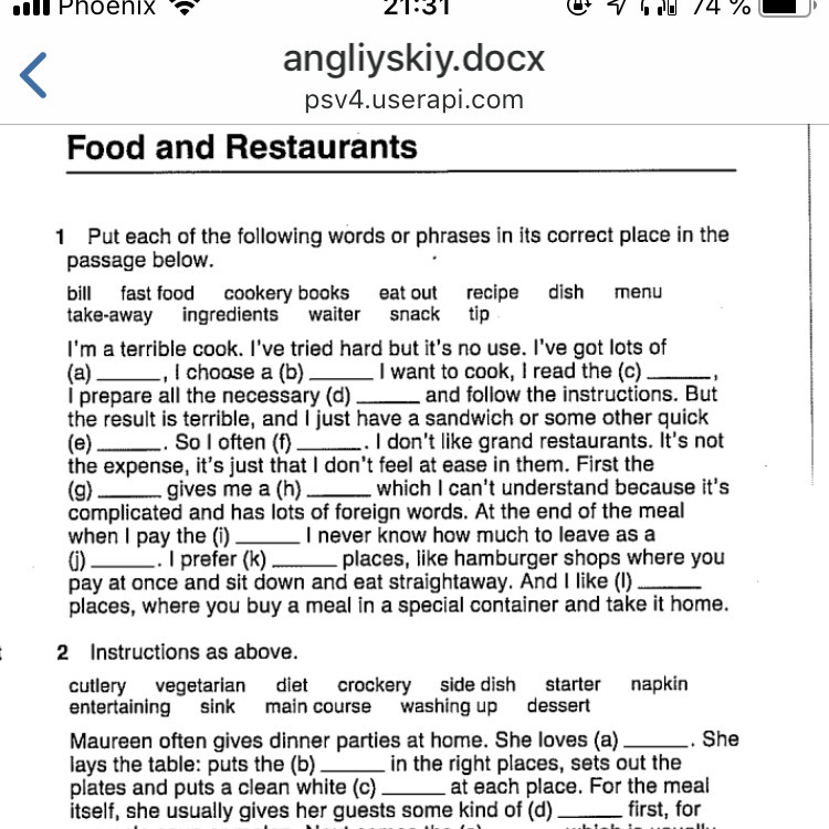 a cookery books b dish c recipe d ingredients e snack f eat out g waiter h menu j bill k fast food l take-away