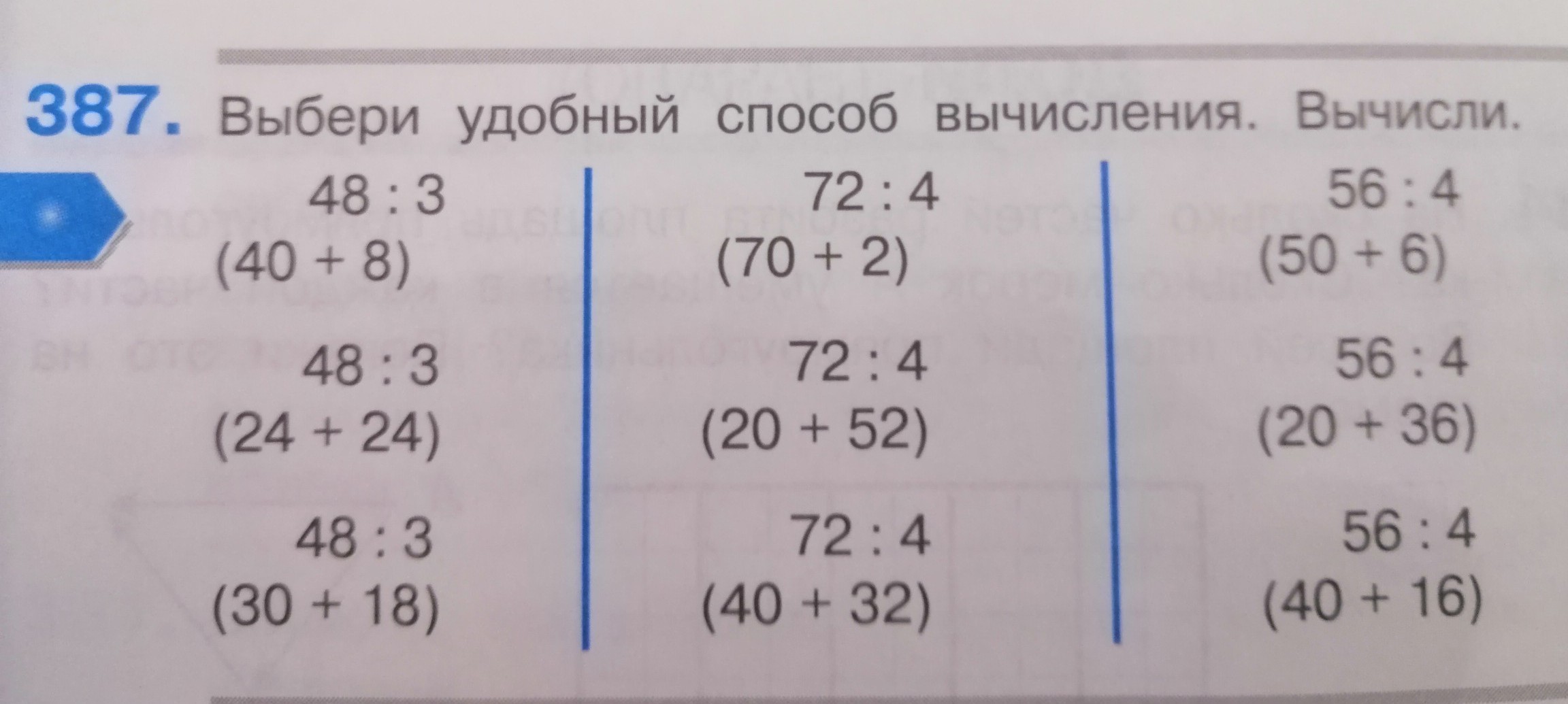 Причем из этих двух строчек предпочтительнее третья, так как делимое в этом случае раскладывается на сумму чисел, каждое из которых делится на делитель в пределах таблицы умножения: