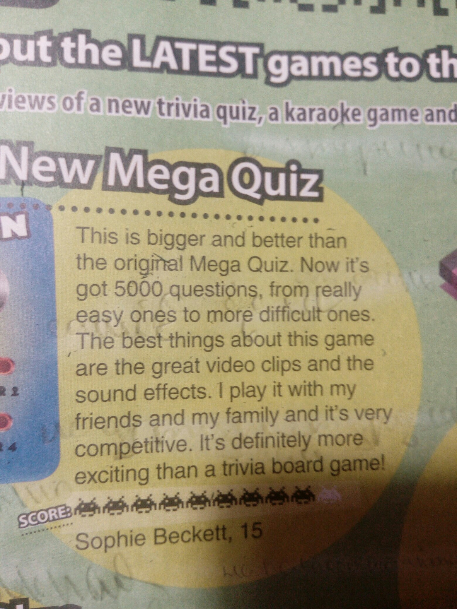 Это больше и лучше, чем оригинальный Mega Quiz. Теперь у него 5000 вопросов, от действительно простых до более сложных. Лучшее вещь в этой игре - отличные видеоклипы и звуковые эффекты. Я играю в это с моими друзьями и семьей, и это очень конкурентоспособно. Это определенно более захватывающе, чем пустяковая настольная игра ! Софи Беккет, 15