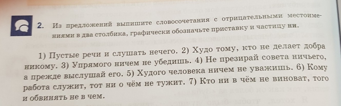 нечего(1). никому(2).ничем(2). ничьего(2). не презирай(1). не уважишь(1). ни о чем(2). не тужит(1).ни в чем(2). не виноват(1). не в чем(1). Я так и не поняла о столбиках. Я написала так, что с Не в первой, а во второй: с Ни. Возможно, глаголы тебе не нужны