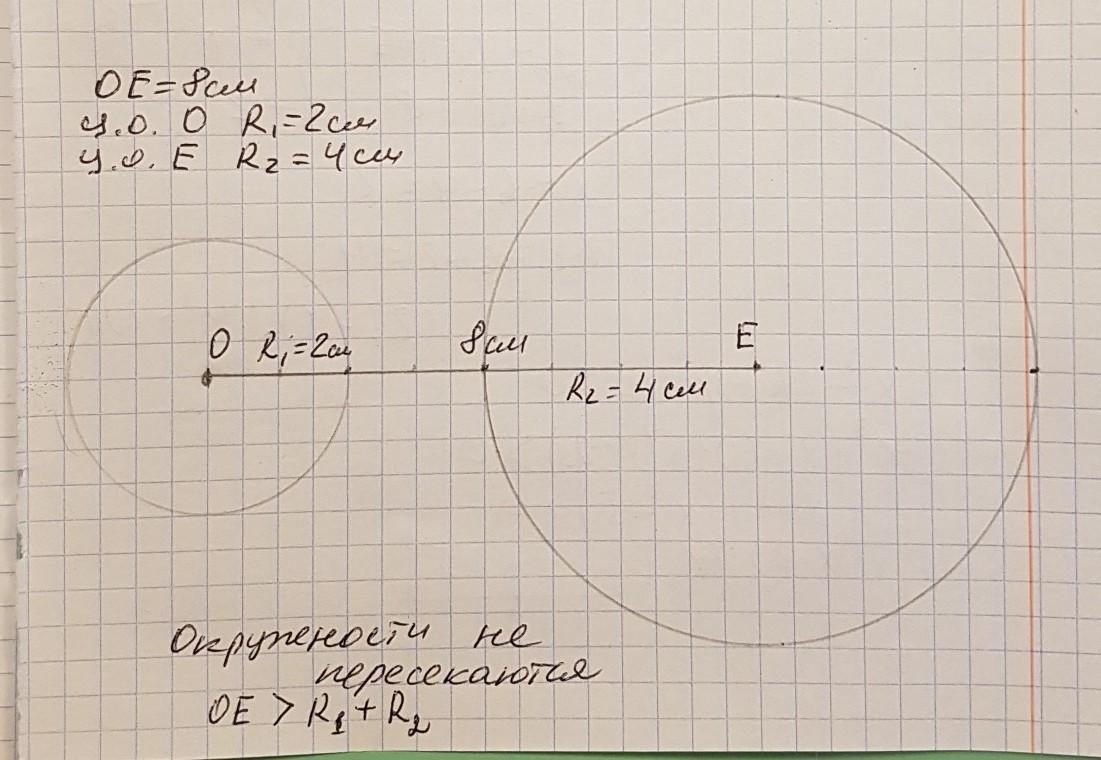 отметьте точки О и E так чтобы OE равен 8 см Постройте окружность с центром О и радиусом 2 см и окружность с центром E радиусом 4 см пересекаются ли эти окружности
