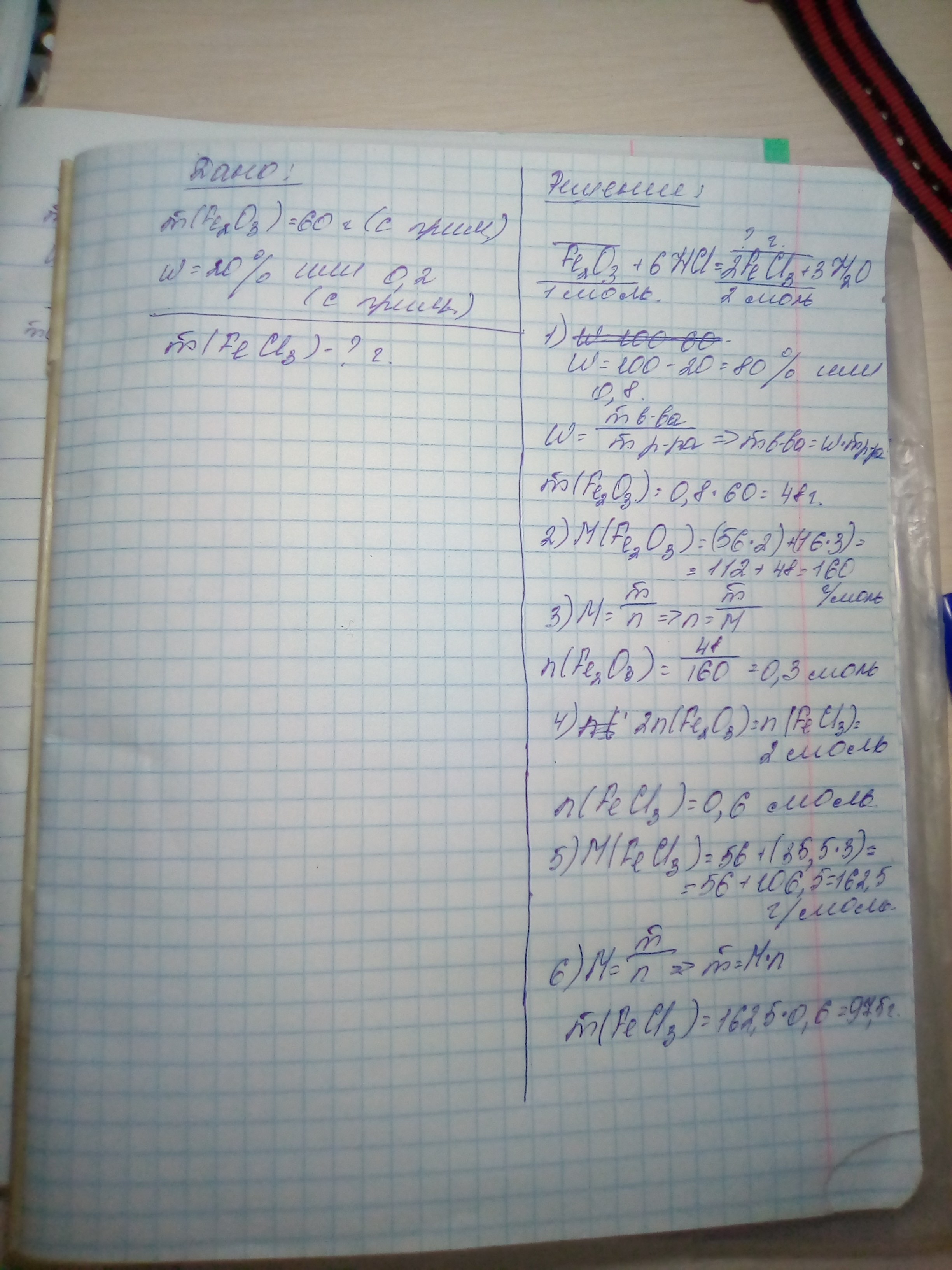 Рассчитайте массу хлорида железа (lll), который образуется при взаимодействии соляной кислоты с 60 граммами оксида железа (lll), содержащего 20 процентов примесей.