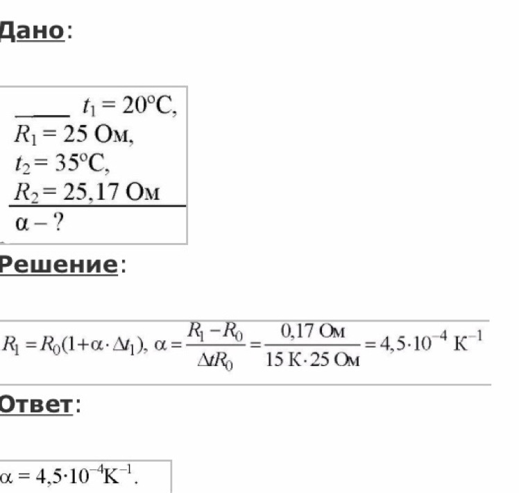 Сопротивление проводника при 20°C равно 25 Ом а при 35°C увеличилось до 25,17 Ом. Определите температурный коэффициент сопротивления вещества, из которого сделан проводник