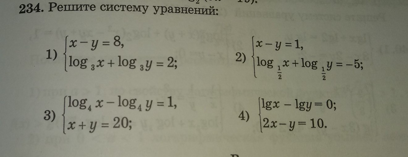 3) log₄x - log₄y = 1; x + y = 20; log₄x/y = log₄4; x = 20 - y; ОДЗ: x > 0; y > 0;