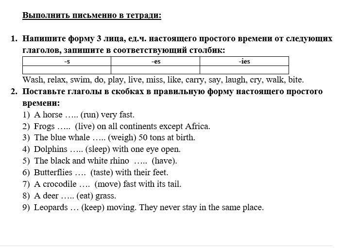 1) Washes, relaxes, swims, does, plays, lives, misses, likes, carries, sayes, laughes, cries, walks, bites.