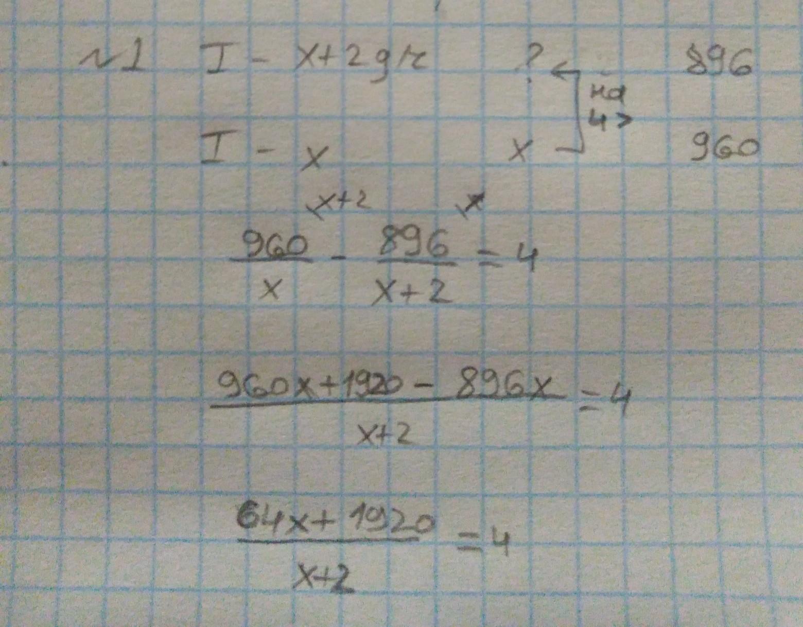 Первый рабочий за час делает на 2 детали больше чем второй рабочий и заканчивает работу под заказом состоящим из 896 деталей на 4 часа раньше чем второй рабочий выполняет заказ состоящих из 960 таких же деталей. Сколько деталей делает в час первый рабочий? Желательно таблица. Через уравнение.