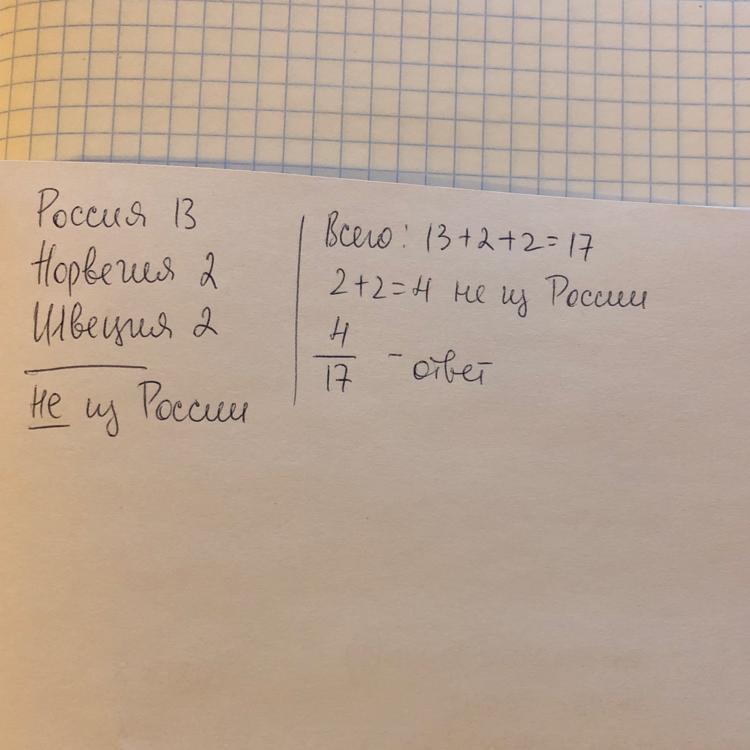 В лыжных гонках участвуют 13 спортсменов из россии, 2 спортсмена из норвегии 2 спортсмена из швеции.найдите вероятность того,что первым будет стартовать спортсмен НЕ из России.