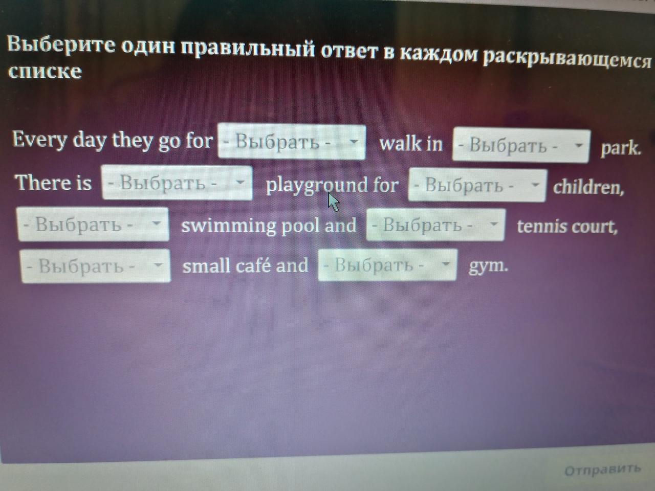 Every day they go for a walk in the park. There is a playground for the children, the swimming pool and the tennis court, a small cafe and the gym.