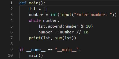 Python - Пользователь вводит число любого размера (124234654672 или 867734534), и программа с помощью цикла должна достать каждую цифру отдельно и просуммировать(8+6+7+7+3+4+5+3+4)