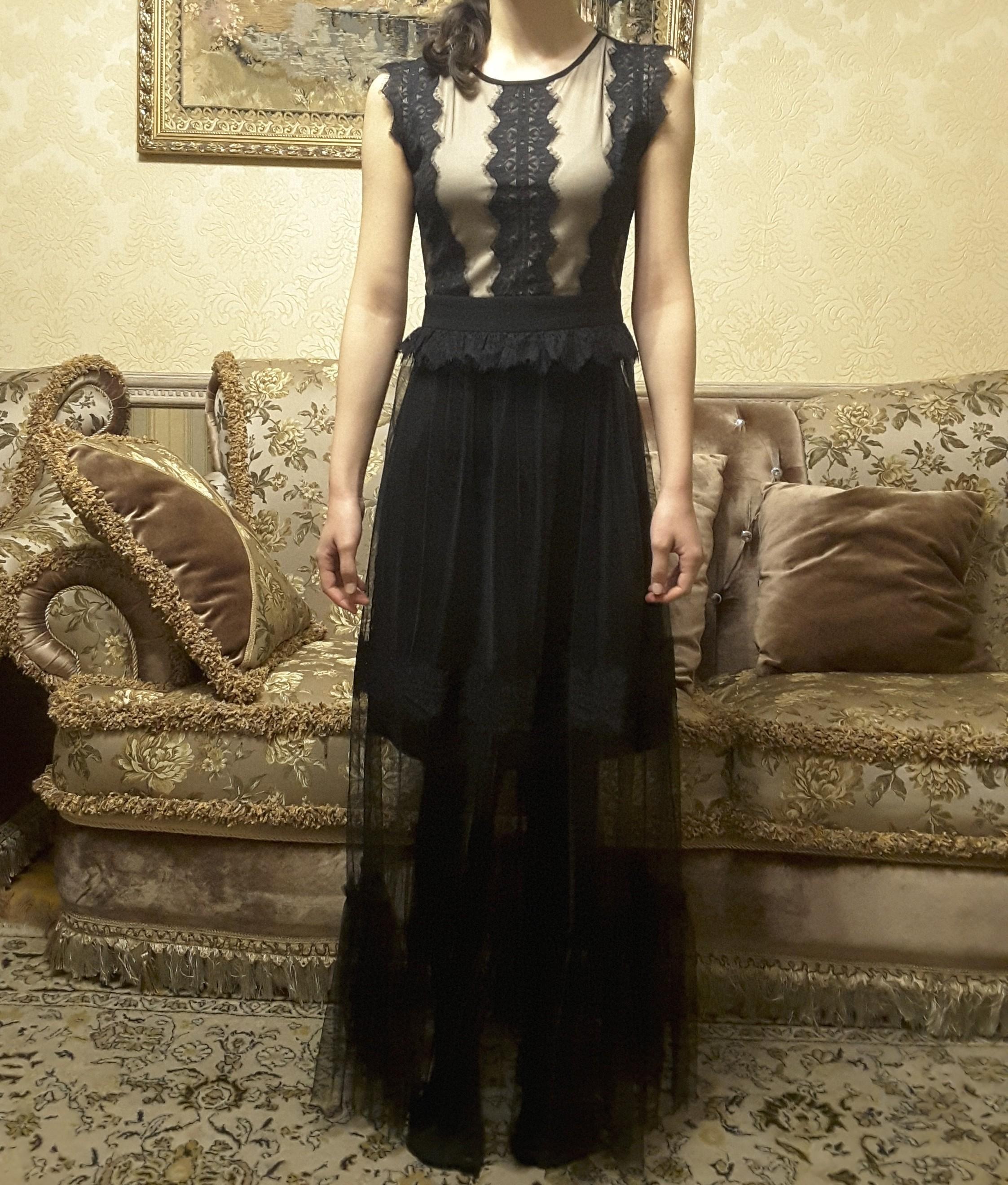 сегодня я вам расскажу про это платье. Как вы видите, это платье длинное, так что в нём не пойдешь в магазин за кефиром. Скорее всего Это платье подходит для разных торжественных мероприятий. Подходит платье для стройных девушек с высоким ростом. Цвет платья чёрный. Снизу, под сеткой (точно не знаю как это называется) находиться юбка до колен, так что можно надевать махровые трусы. Также платье идёт без рукавов, так что можно надеть длинные перчатки. Верх платье украшен чёрным кружевом, сверху на бежевой ткани. также в этом платье есть интересный пояс. Застёжка платья идёт сзади. Лучше всего для этого платья сделать причёску и надеть чёрный туфли на шпильке.