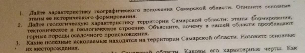 3.Полезные ископаемые на территории Самарской области представлены топливными ресурсами — нефтью, газом и горючими сланцами, а также строительным сырьем: пески, известняк, доломит, мел, глина, сера, опока. Самые богатые месторождения нефти: Мухановское, Дмитриевское и Кулешовское. Глубина их залегания до 3000 м