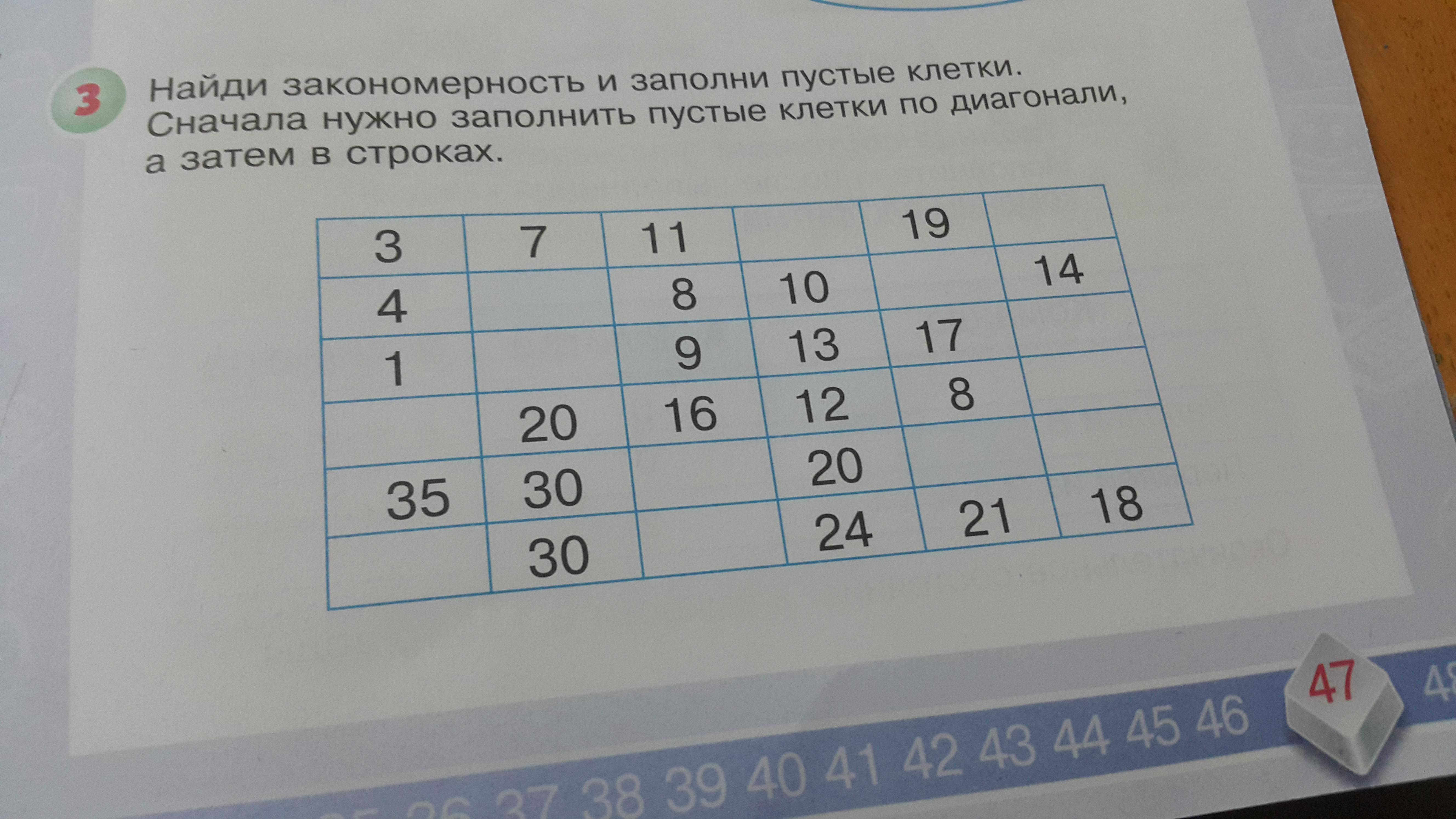 2.в строчку идя от трех до 18:3,7,11,15,19,4,6,8,10,12,14,1,4,9,13,17,21,24, 20,16,12,8,4,35,30,25,20,15,10,33,30,27,24,21,18.