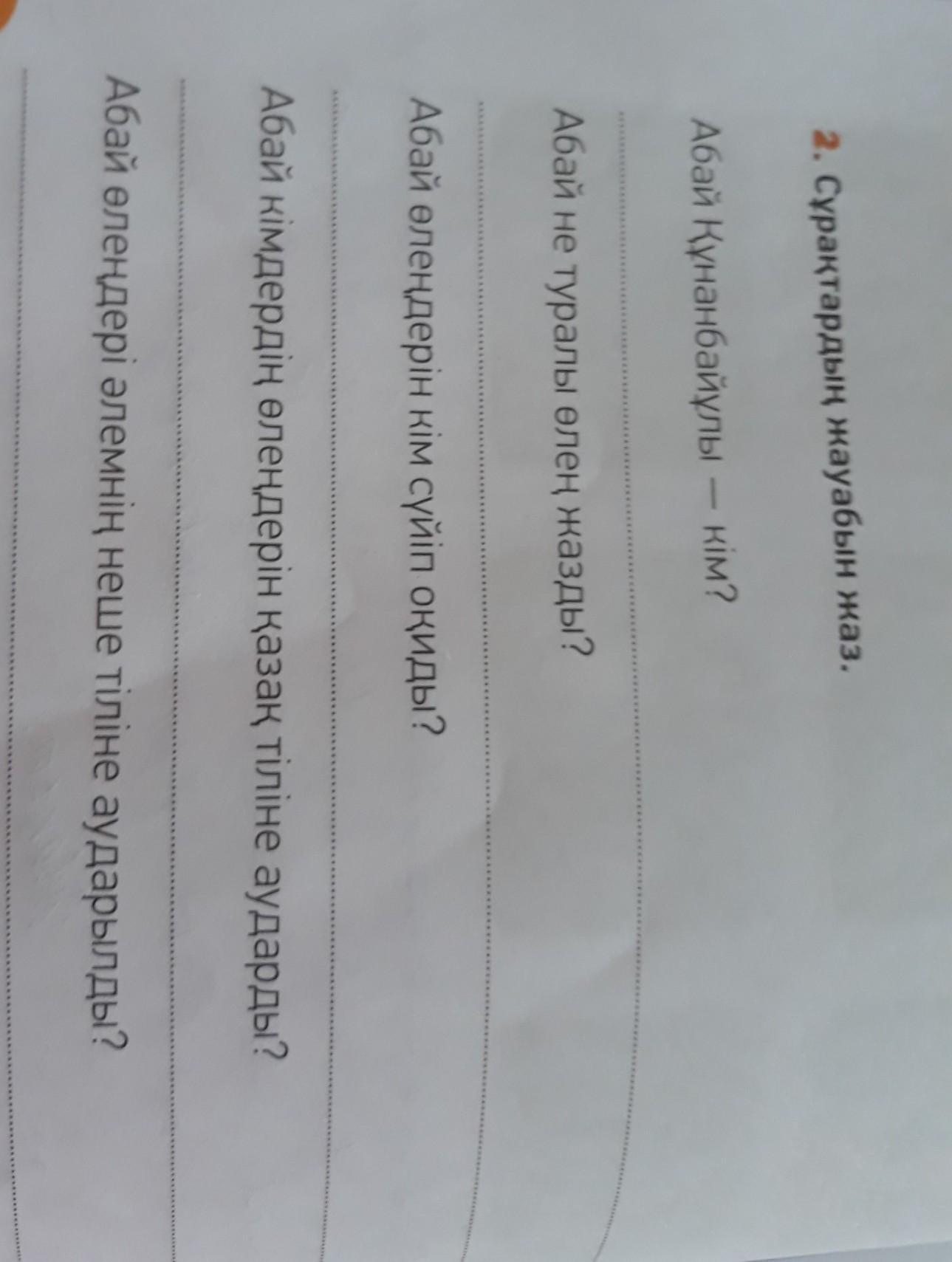 1Абай Құнанбаев.Жазушы.Акын.2.Ғылым таппай мақтанба.Не ол емес,бұл емес.Менің де күнім _күн емес.3.Үлкен кісілер ,мүғалімдер,оқушылар.4.орыстардың тілдерін аударды.5 сол бір тіл аударды.